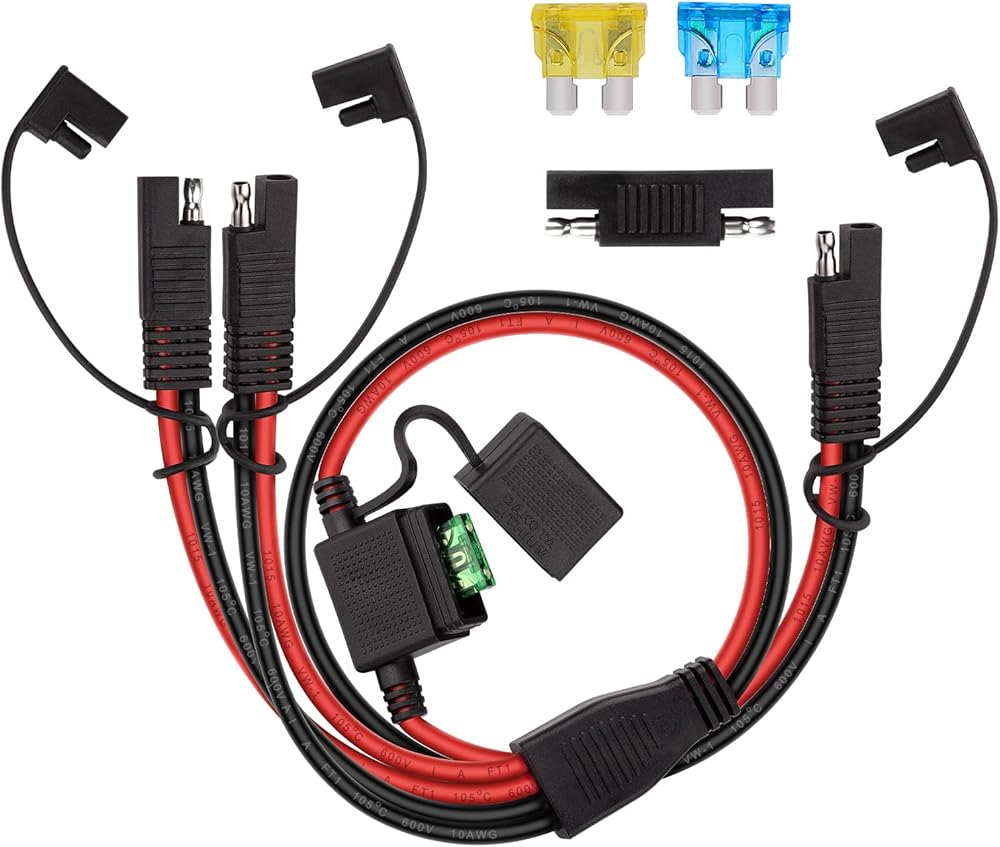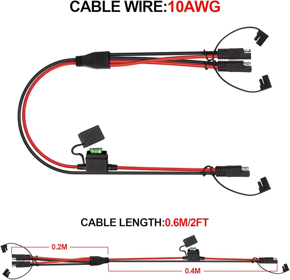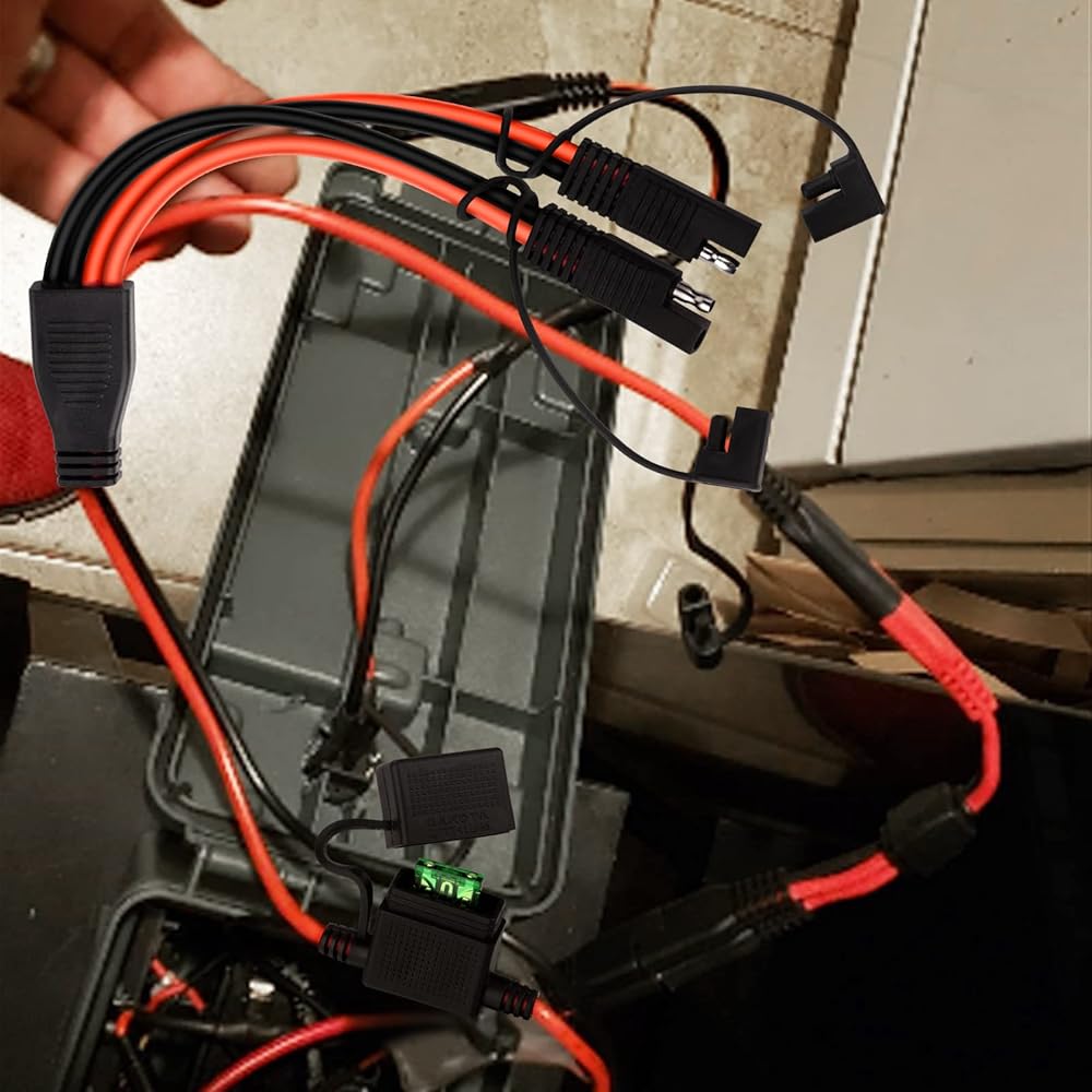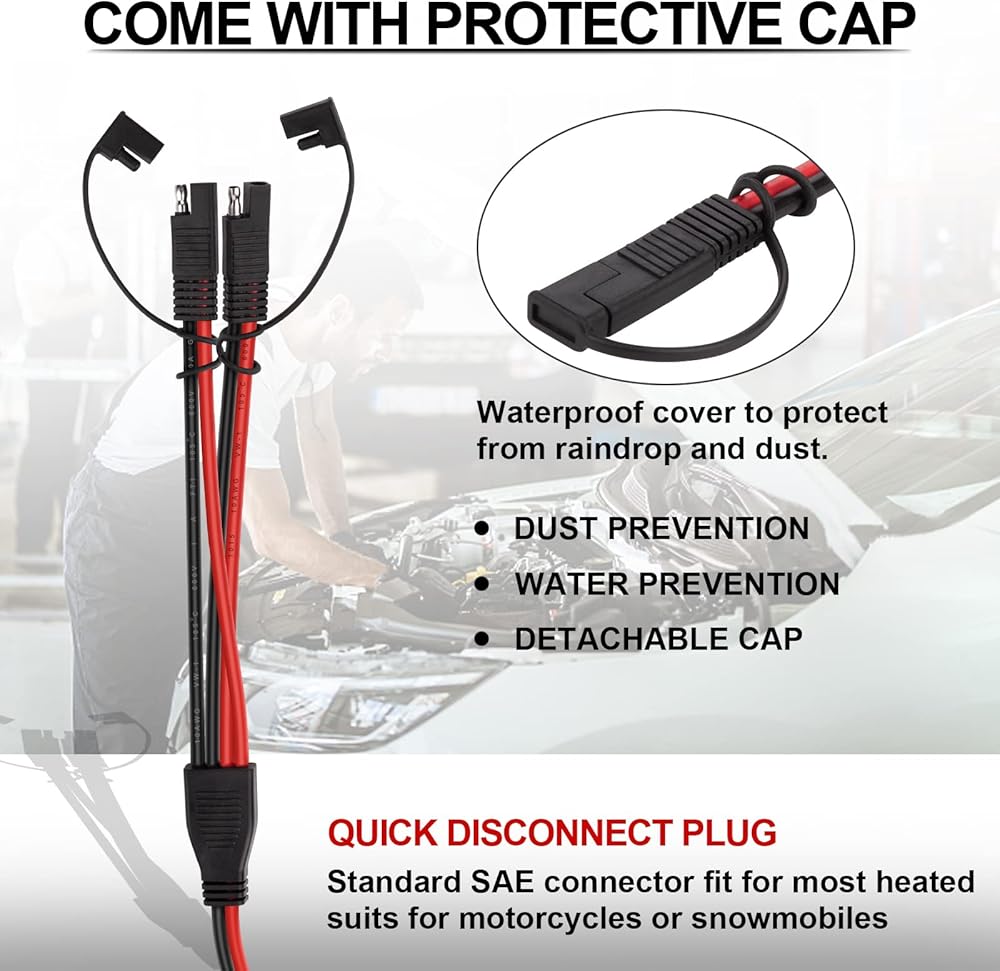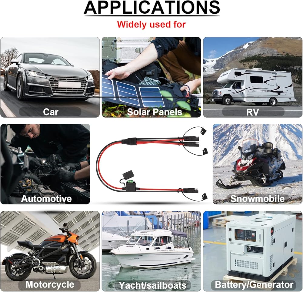 سلك تمديد ثنائي الدبوس مع موصل SAE العالمي، يمكن استخدامه على نطاق واسع في جميع أنواع المركبات والأجهزة، مثل السيارات والدراجات النارية وجزازة العشب وRV ومحرك التصيد وATV وقوارب الكاياك ورشاش الجرارات وعاكس الطاقة والأجهزة الأخرى ذات منافذ SAE .