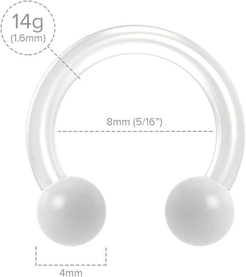 SPECIFICATIONS - Internal Diameter: 8mm. Gauge: 14g. Color: white. Ball End: Ball 4mm. These bioflex lip ring horseshoe are designed and tested for quality. Get the most out of your piercing with these bioflex body jewelry horseshoe