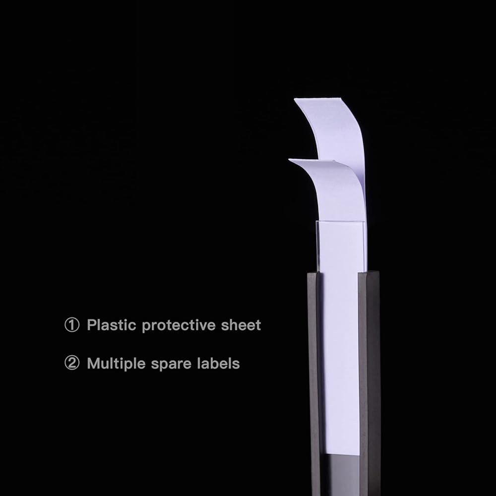 • سهل الاستخدام: اكتب على الشريط الورقي المتضمن، ثم قم بتمرير إدخال الورق والغشاء الواقي الشفاف، ثم قم بلصق حامل الملصق المغناطيسي على سطح نظيف ومسطح، مما يوفر الوقت ويجعل إعادة الوضع أسهل مقارنة بالملصقات اللاصقة التقليدية
