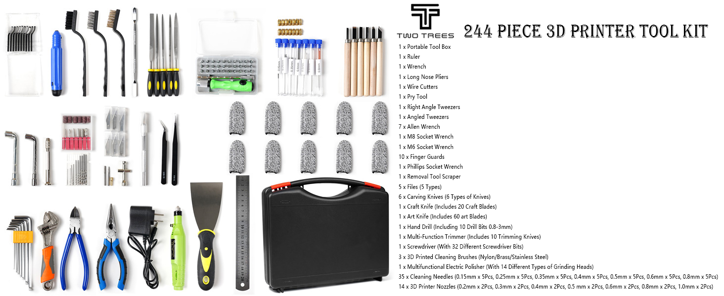 مجموعة أدوات الطابعة ثلاثية الأبعاد المكونة من 244 قطعة من تو تريز، مجموعة تنظيف فوهة الطابعة ثلاثية الأبعاد المتنوعة ومجموعة أدوات الإصلاح، بما في ذلك صندوق الأدوات، لتجميع الطابعة ثلاثية الأبعاد، والتنظيف، والتشذيب، وما إلى ذلك
