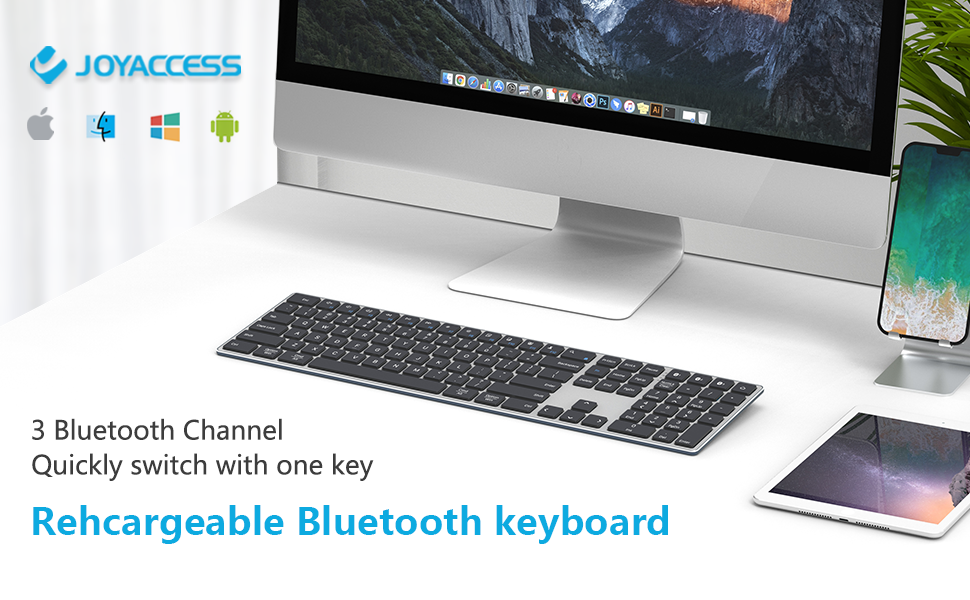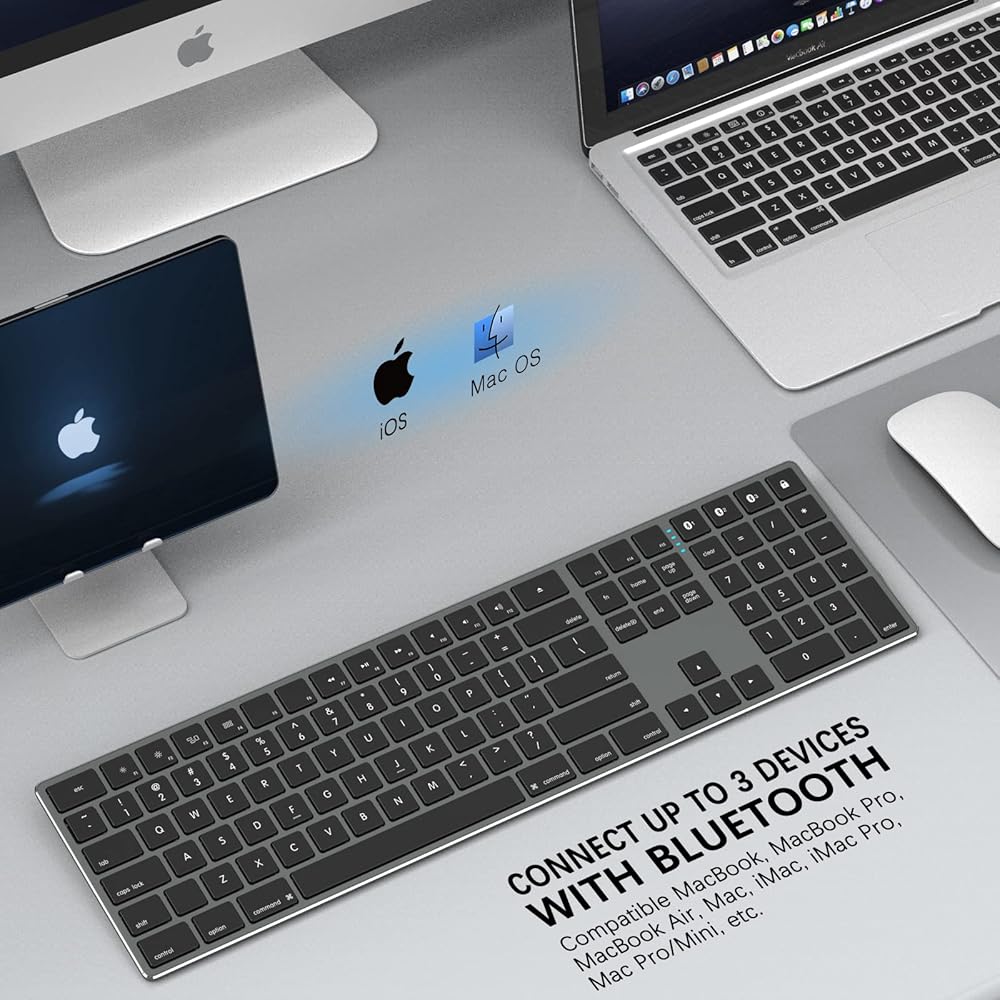 ◀ نحيفة للغاية وكاملة الحجم: لوحة مفاتيح بلوتوث JOYACCESS بسُمك 0.5 بوصة فقط، لوحة المفاتيح كاملة الحجم المزودة بلوحة مفاتيح رقمية مثالية للإنتاجية أثناء التنقل. حجم لوحة المفاتيح هو 17 بوصة × 7.5 بوصة × 0.71 بوصة. خفيفة للغاية ولوحة مفاتيح رفيعة للغاية من الألومنيوم تتناسب مع شكل ولون طراز Macbook.