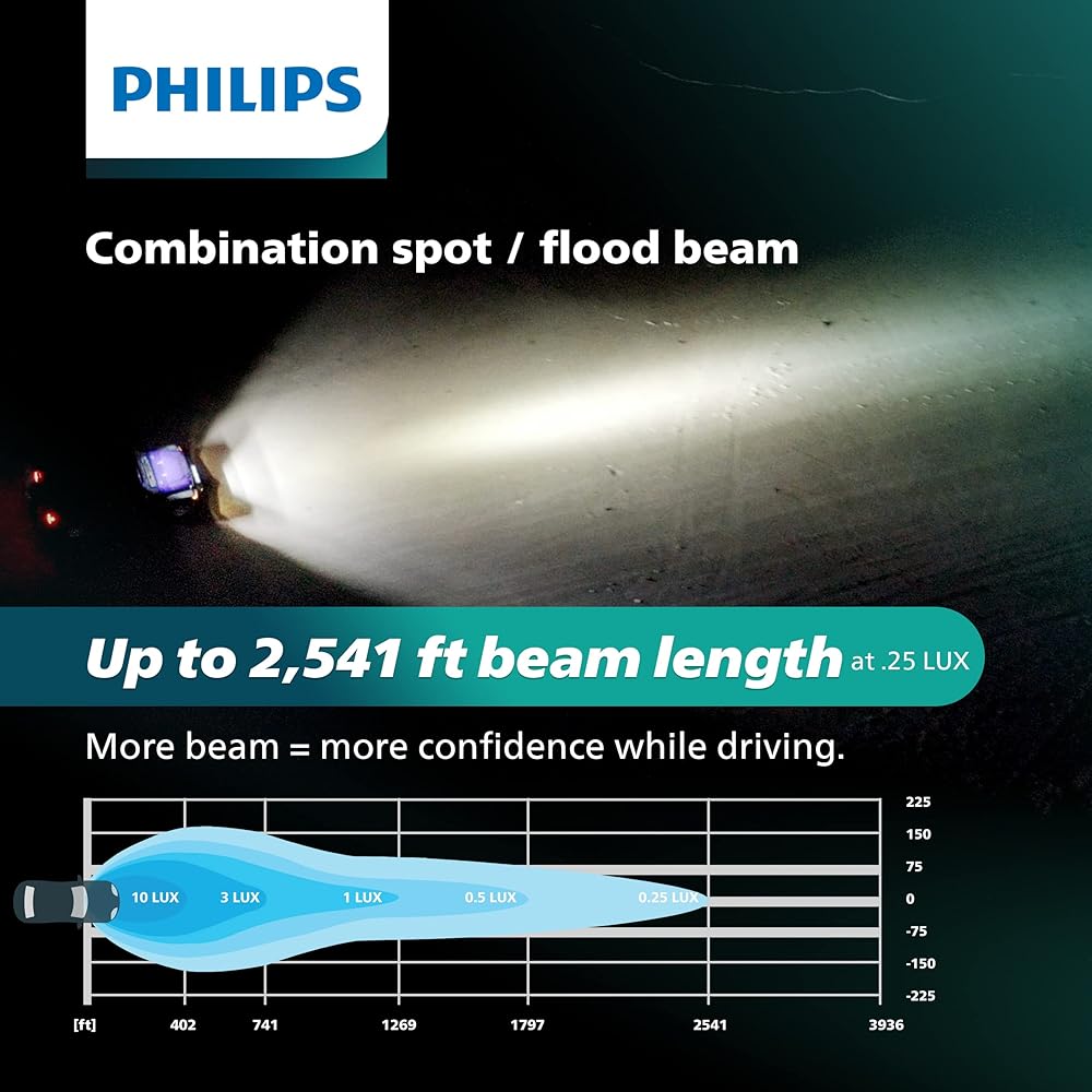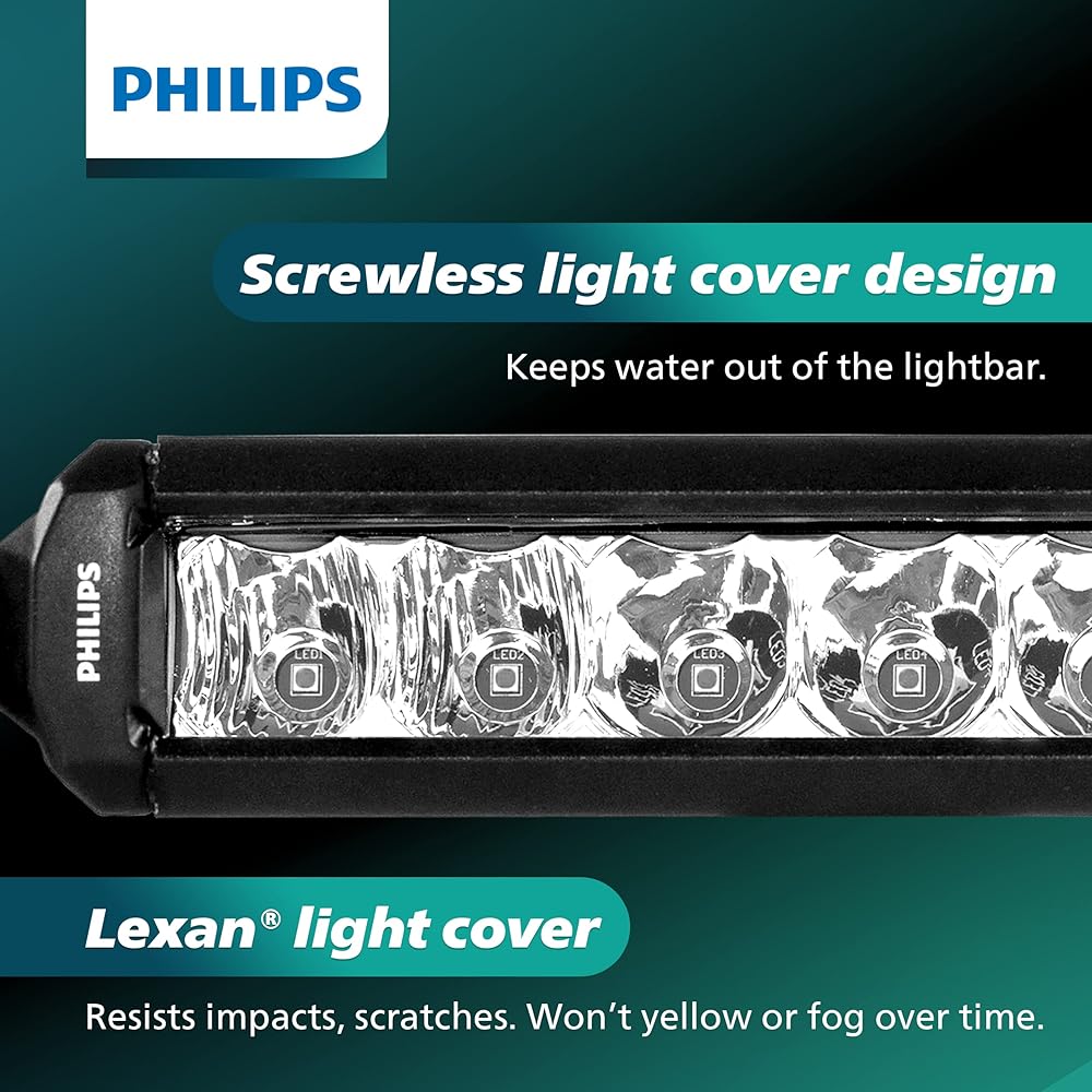 PERFORMANCE & STYLE: Provides outstanding beam performance with brilliant illumination that extends up to 1269 feet. Superior 6500 Kelvin light with 4760 raw lumens. Using high power LEDs, the Ultinon Drive series provides ample visibility for faster reactions. Philips light bars are designed with a style that can withstand the toughest off-road and weather conditions.