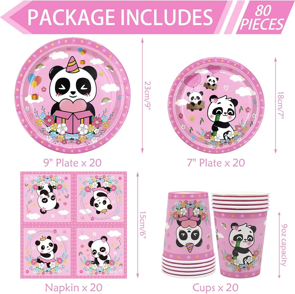 Panda Party Tableware Supplies Kit: You will gain 20 9"dinner plates + 20 7" dessert plates + 20 9oz paper cups + 20 napkins.