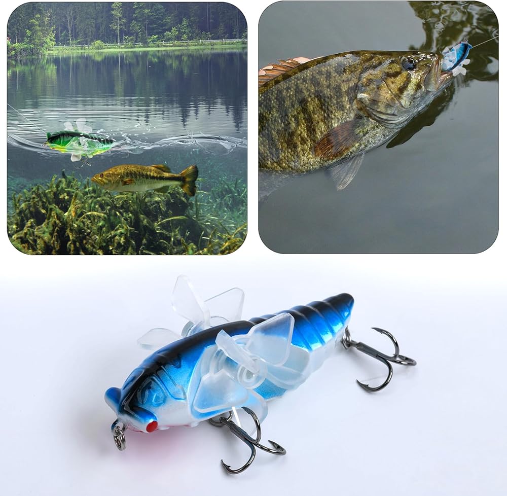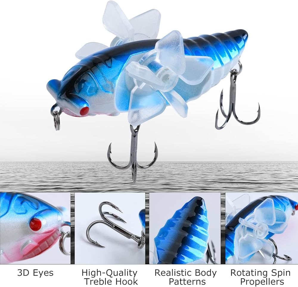 【ابتكار بيونيك متطور】 يتميز طُعم الصيد الخاص بنا بتصميم مبتكر، حيث يعرض مراوح مزدوجة تخلق مظهرًا جذابًا ومميزًا. هذه التحفة الفنية بمثابة الأداة المثالية لإغراء الأسماك. من خلال الاستفادة من سمات الطفو الرائعة والتوازن الفني لمراوحها المزدوجة التي تدور على السطح، فإنها تلتقط فضول الأسماك بسلاسة.
