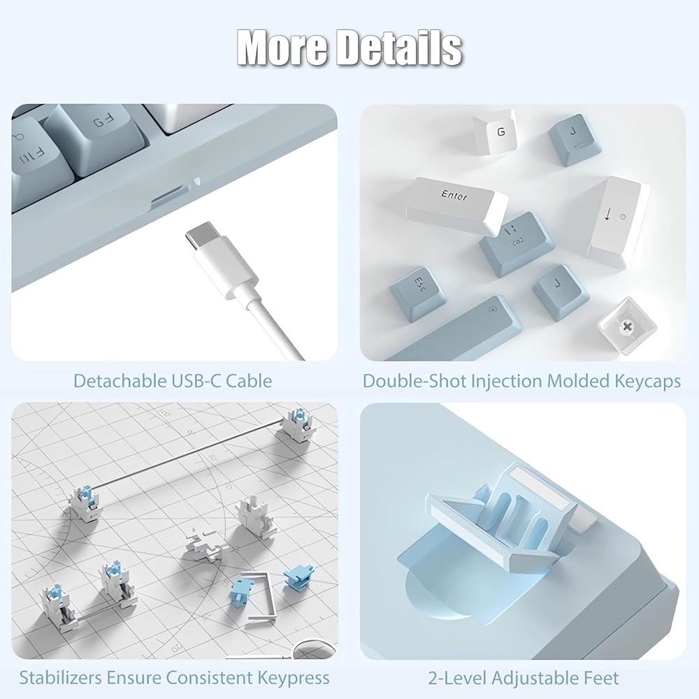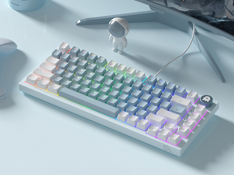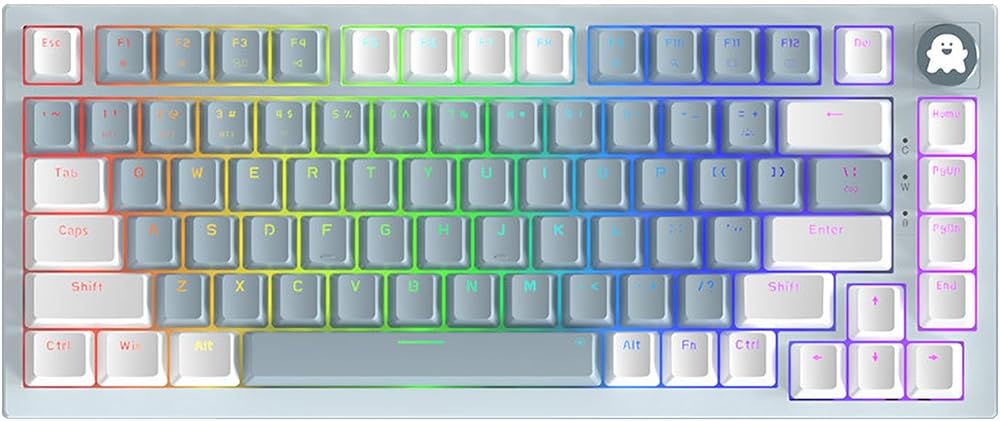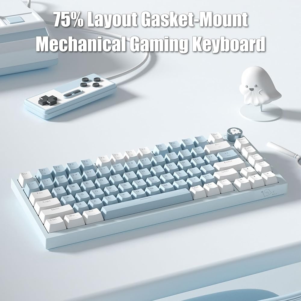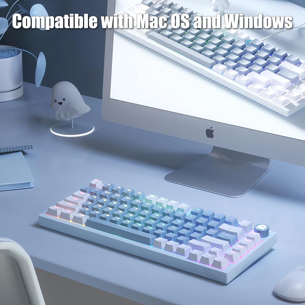 لوحة مفاتيح ميكانيكية للألعاب بنسبة 75% مع مقبض مستوى الصوت RGB قوس قزح LED بإضاءة خلفية مثبتة على TKL 82 مفتاح NKRO قابل للتبديل باللون الأزرق مع كابل USB-C سلكي قابل للفصل لنظام Win/Mac، أزرق/أبيض