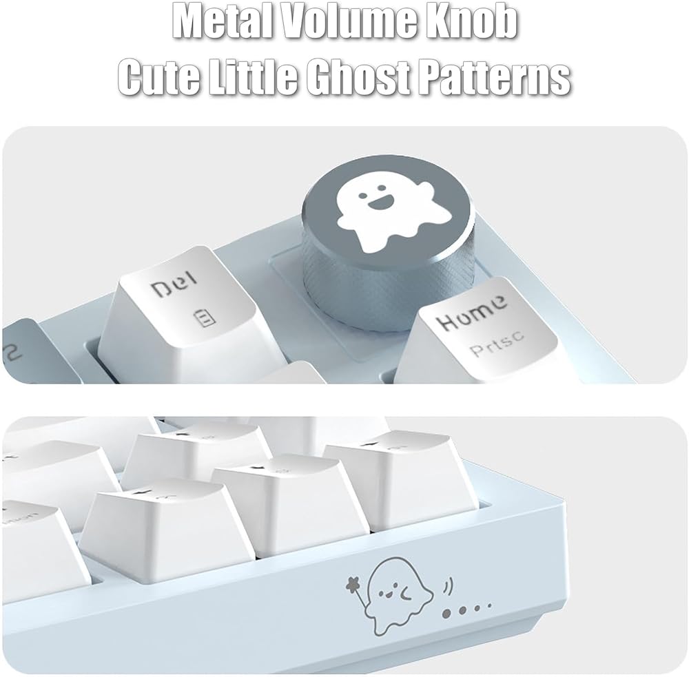 [كابل USB-C سلكي قابل للفصل ومقبض صوت لطيف] - يوفر الاتصال السلكي من النوع C للوحة مفاتيح الألعاب نقلًا أكثر استقرارًا. فصل أسلاك الربط، ومقبض التحكم في مستوى الصوت، وتصميم إنساني وأكثر ملاءمة. قم بتدوير المقبض لضبط مستوى الصوت، واضغط على المقبض للإيقاف المؤقت أو التشغيل. أنماط الأشباح الصغيرة اللطيفة تجلب لك المزيد من المرح أثناء الكتابة أو اللعب.