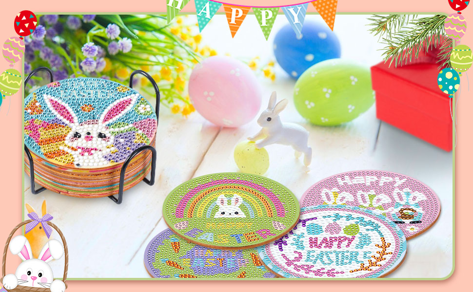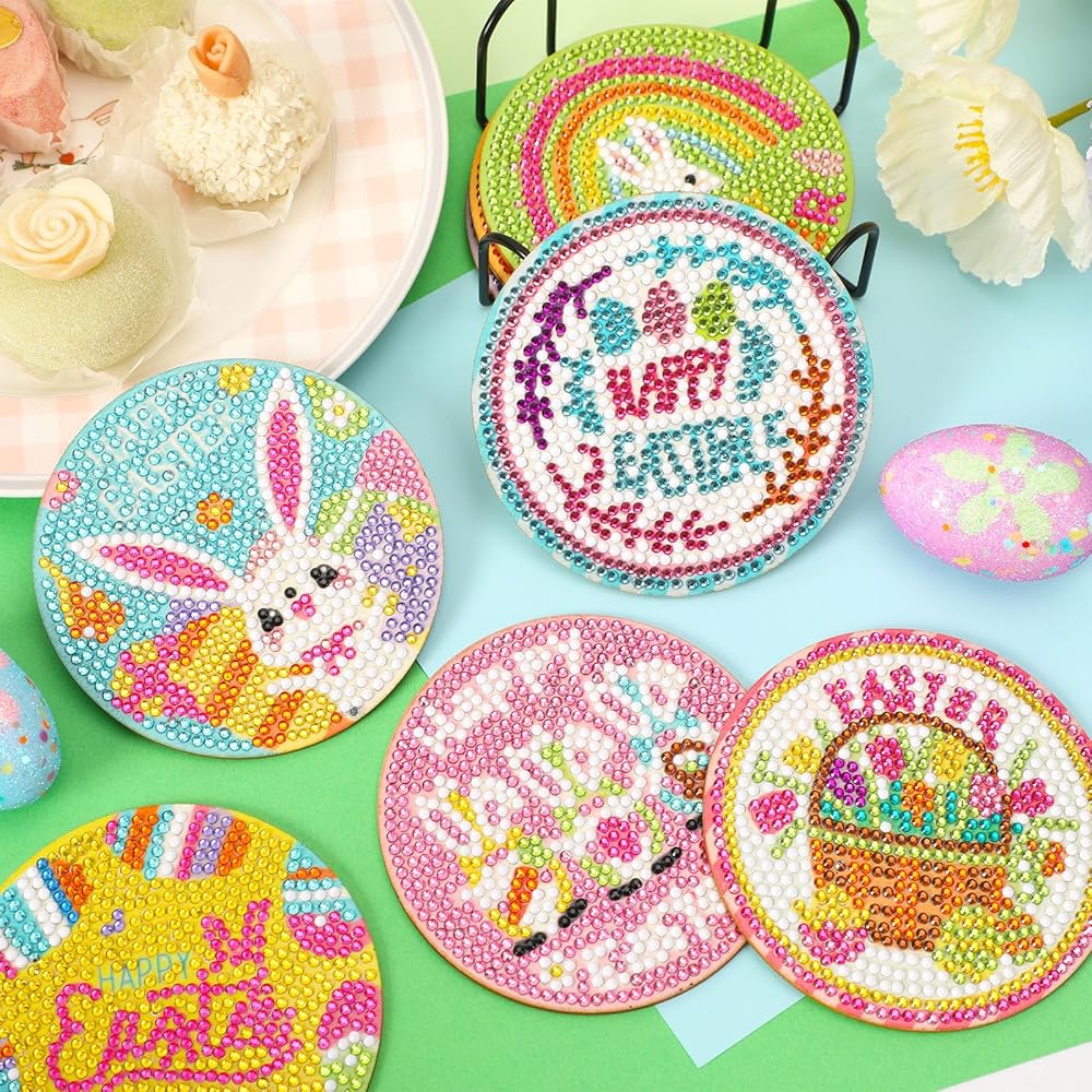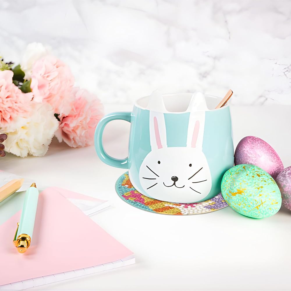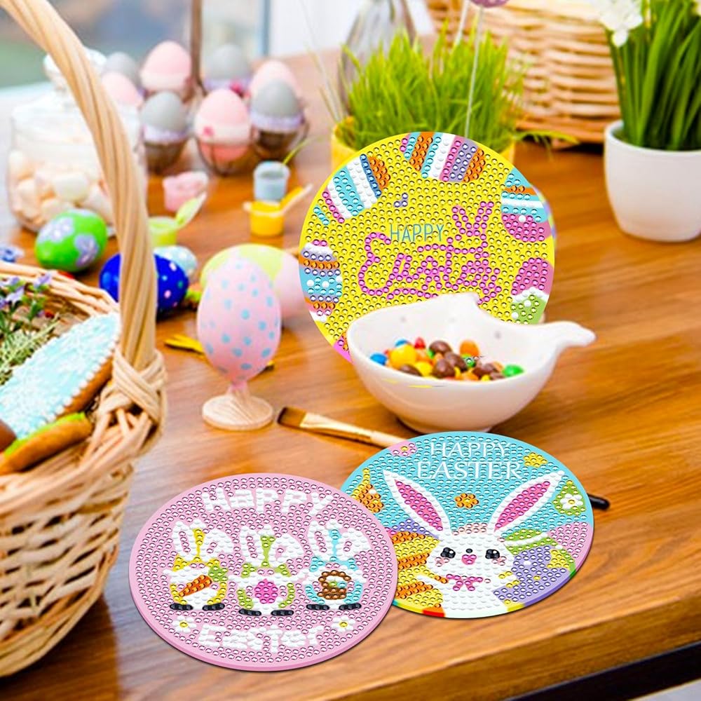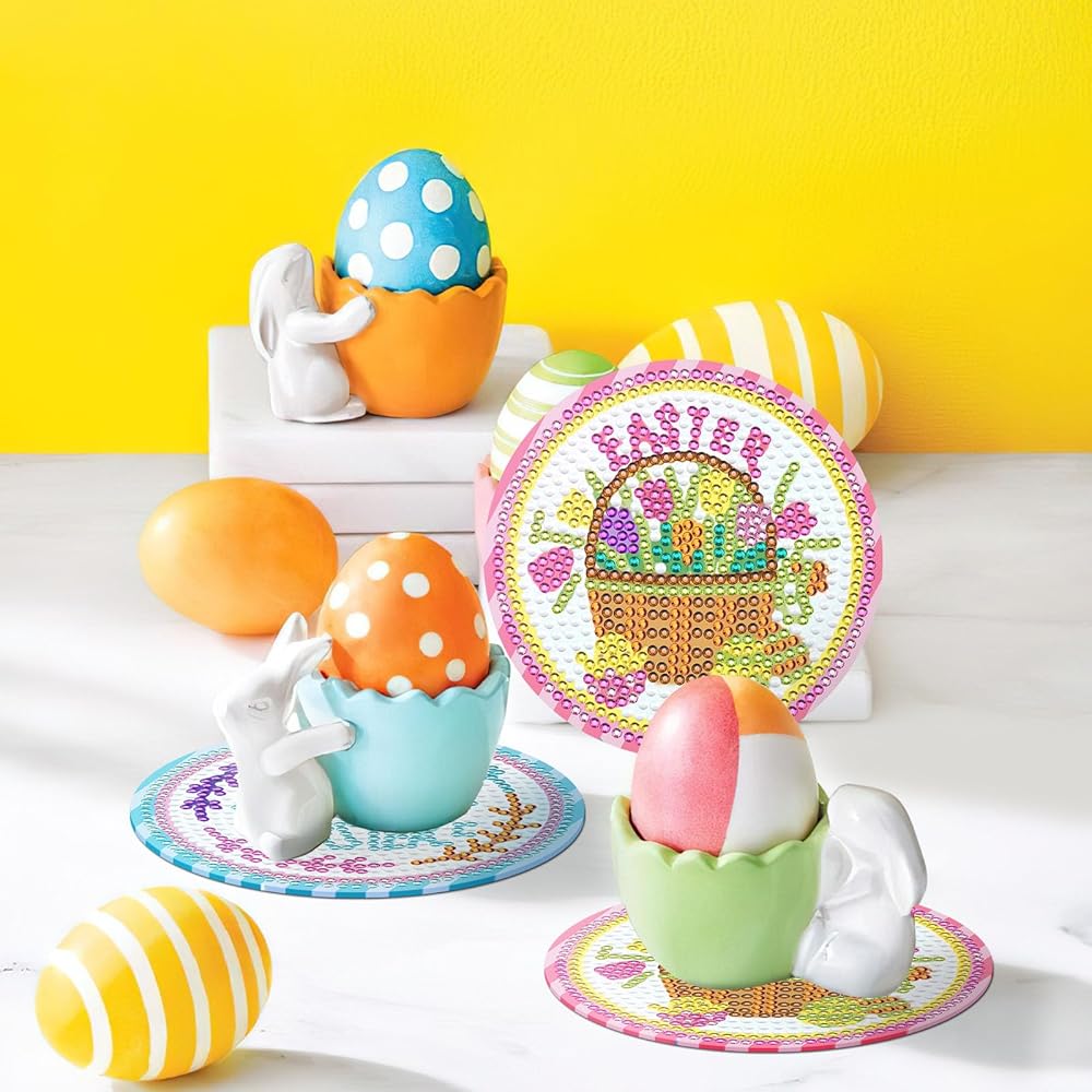 8 قطع من قواعد الأكواب الفنية الماسية لعيد الفصح من JUNEBRUHSS، قواعد الأكواب المصنوعة من الألماس على شكل أرنب عيد الفصح مع حامل مجموعات الطلاء لمستلزمات تزيين المنزل وحفلات عيد الفصح