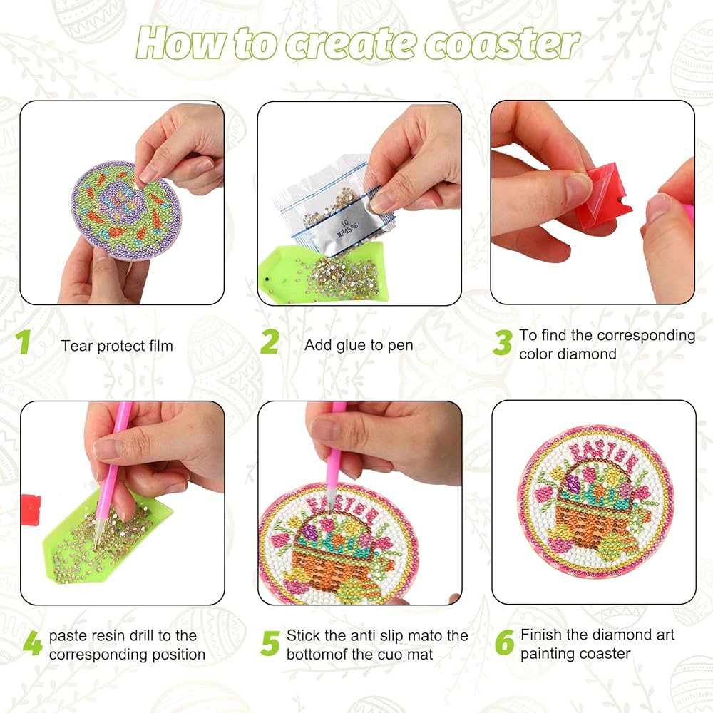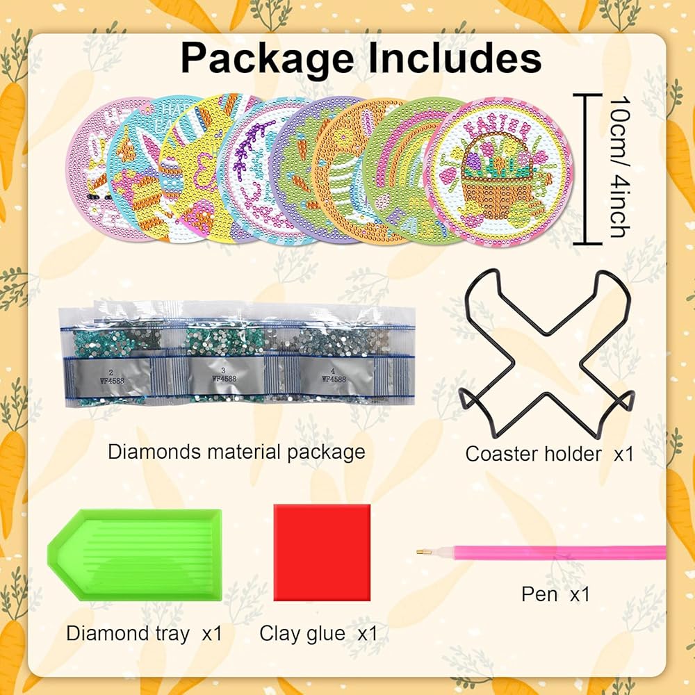 محتويات العبوة: سوف تحصل على 8 قواعد أكواب فنية ماسية لعيد الفصح بأنماط مختلفة، وحامل حديد واحد، ومجموعة من الماس باللون المناسب، وقطعة واحدة من غراء الطين، وقلم ماسي واحد، وصينية ماسية واحدة. يبلغ قطر قواعد الأكواب الفنية الماسية لعيد الفصح 4 بوصات