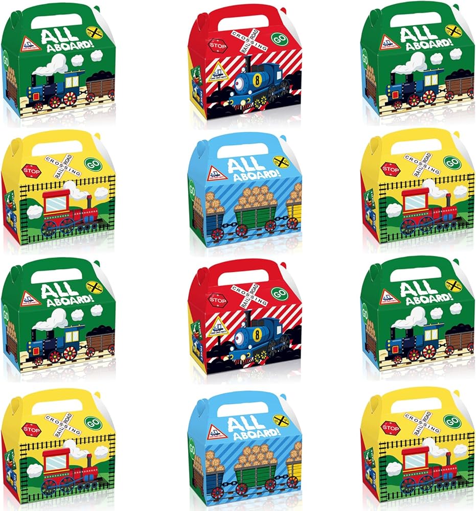 Package Contents: The package contains 12 pieces of Railroad Train themed party gift box in 4 different styles, each style has 3 pieces, enough quantity for your upcoming party.
