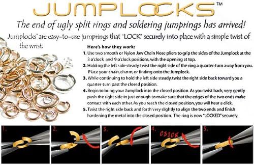 Connect your jewelry components with The Beadsmith JumpLock rings. These easy-to-use jump rings “lock” securely into place with the simple twist of the wrist. To use, grasp the sides of a JumpLock at the 3 and 9 o'clock positions with 2 smooth or nylon jaw-chain nose pliers. Make sure the opening of the jump ring is at the top. Hold one side of the ring steady and twist the other side of the ring a quarter-turn away. Then, insert a chain, charm, or finding into the JumpLock. Twist the same side of the jump ring back towards you. Twist a quarter-turn past the closed position. Then, slowly twist the ring back to the closed position. As you twist, gently push the ends of the jump ring together so they touch each other. When the ring reaches the closed position, you should hear a click. After you hear that click, gently wiggle the sides of the jump ring back and forth to align the ends, and finish hardening the metal into the closed position. When used correctly, these jump rings will remain locked and keep your jewelry pieces intact.