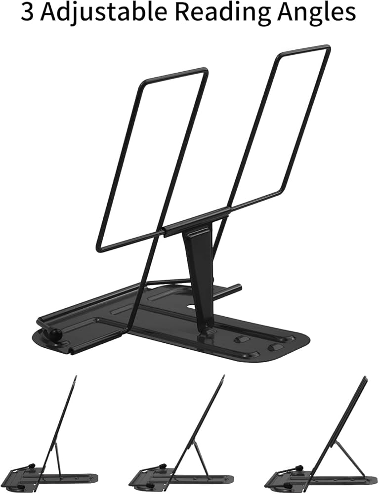Metal Book Stand for Desk, Adjustable Reading Rest Book Holder, Portable Cookbook Documents Holder, Sturdy Typing Stand for Recipes Textbooks Tablet Music Books with Page Clips