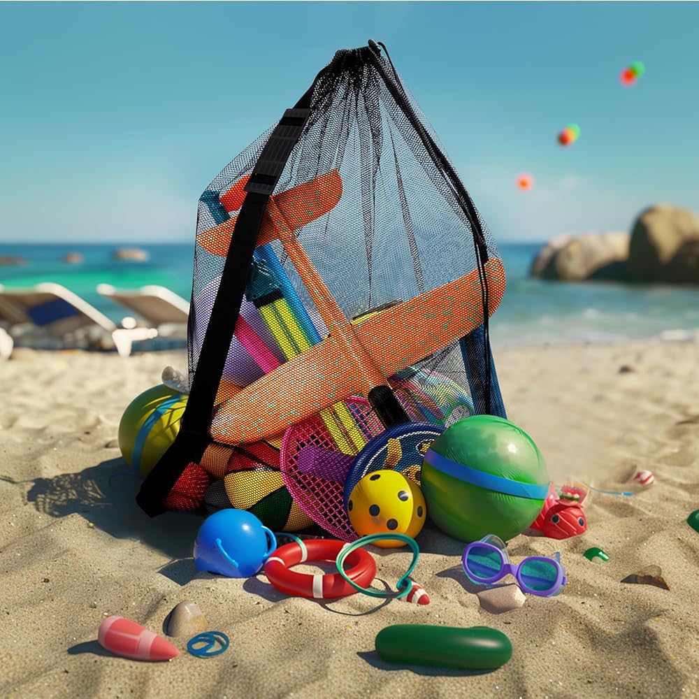 • You bought this to carry sand toys to and from the beach it works out great! Carrying the toys back from the beach you can spray them off with the hose and shake it all the sand and water fall through the mesh,Great that is mesh this way the smell doesn't stay in.