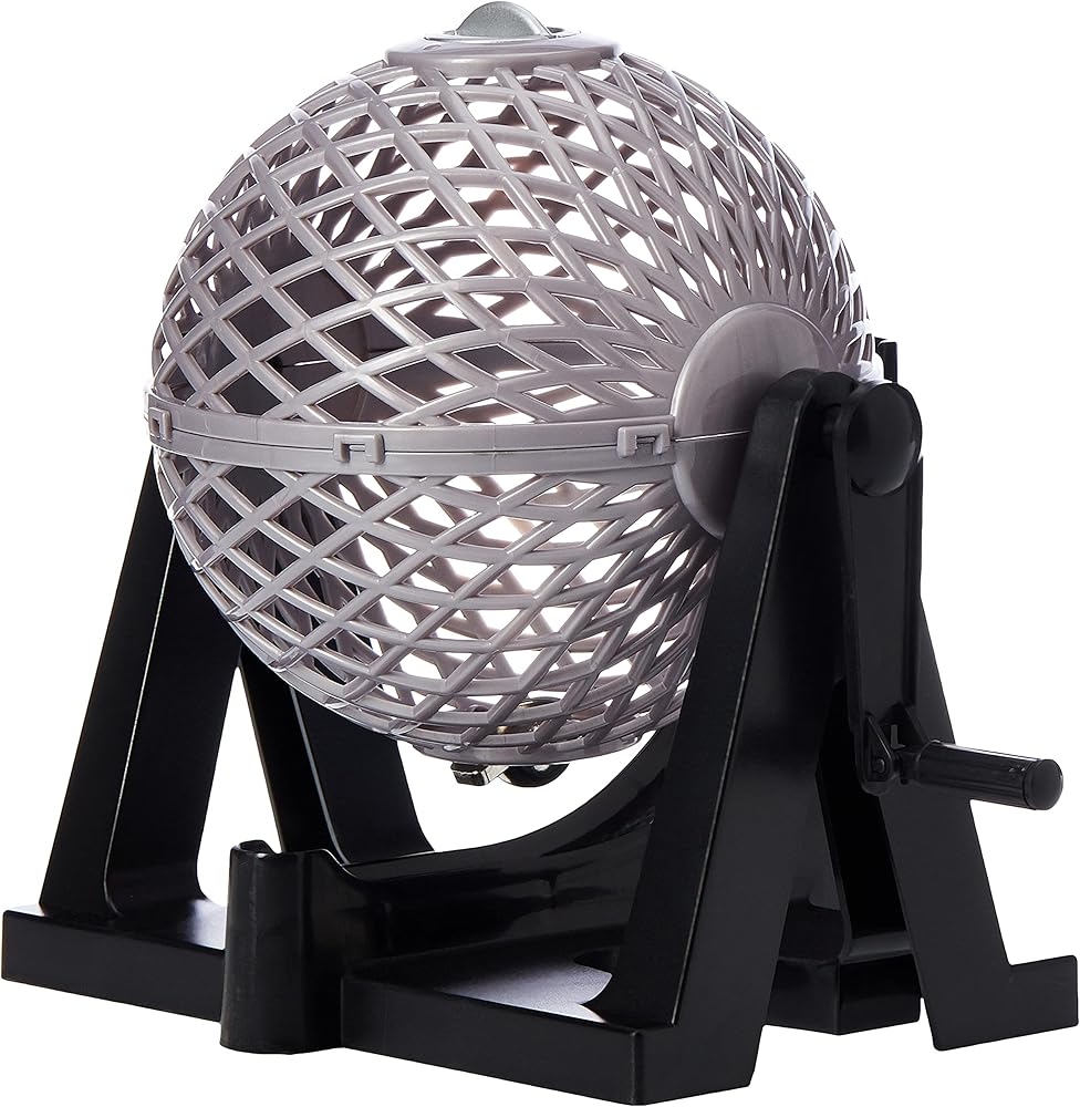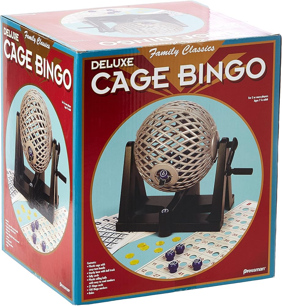 Deluxe Cage Bingo - Contents: Plastic cage, base with ball track, tally card, plastic calling balls, 21 bingo cards, bingo markers, instructions.