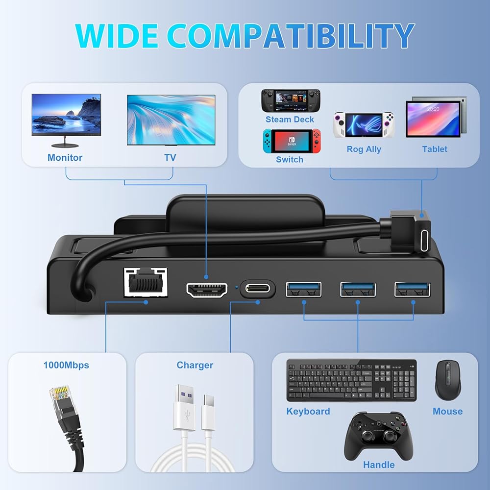 • 【توافق مثالي】: تم تصميم محطة الإرساء هذه لسطح صمام البخار. يمكنه أيضًا دعم الأجهزة الأخرى ذات منافذ USB-C مثل Nintendo Switch/iPad/Samsung Tablet/هواتف Android، إلخ. متوافق مع أنظمة تشغيل متعددة: Microsoft Windows/IOS/Android. لا يلزم ترقية البرامج الثابتة، قم بالتوصيل والتشغيل. (ملاحظة: يتطلب أن يدعم جهازك وظيفة تصوير الشاشة)