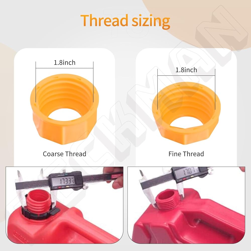 مناسبة لمعظم علب الغاز 1/2/5/10 جالون، 6 أغطية طوق لولبية جميعها 1.75 بوصة، 3 منها خيوط خشنة، 3 خيوط دقيقة. قبل شراء هذه المجموعة، يرجى التحقق من القطر الخارجي لخزانات الغاز الخاصة بك