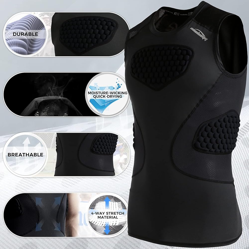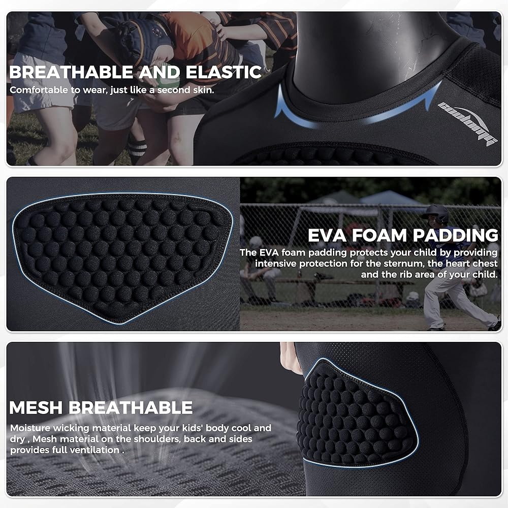 • المواد: 85% بوليستر + 15% سباندكس. تنفس ومرنة. مريح في الارتداء، تمامًا مثل الجلد الثاني. تحمي بطانة إسفنجية EVA منطقة الصدر والقلب والأضلاع لأطفالك من التأثيرات المفاجئة والإصابات الطفيفة من الكرات والرميات والضربات القوية.