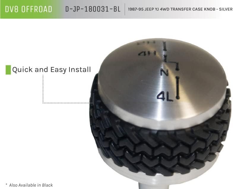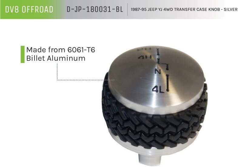 DV8 Offroad's Wrangler YJ Shift Knobs are made from billet aluminum giving it a chrome appearance. They feature our patented 'Tired Tread' design grip. This Ânot only feels good when resting your hand on it, but also provides a better tactile feel when it comes time to throw a shift. Key Features: Billet Aluminum Tire Tread Pattern for Extra Grip Fitment  MODEL YEARS Jeep Wrangler YJ 1987-1995