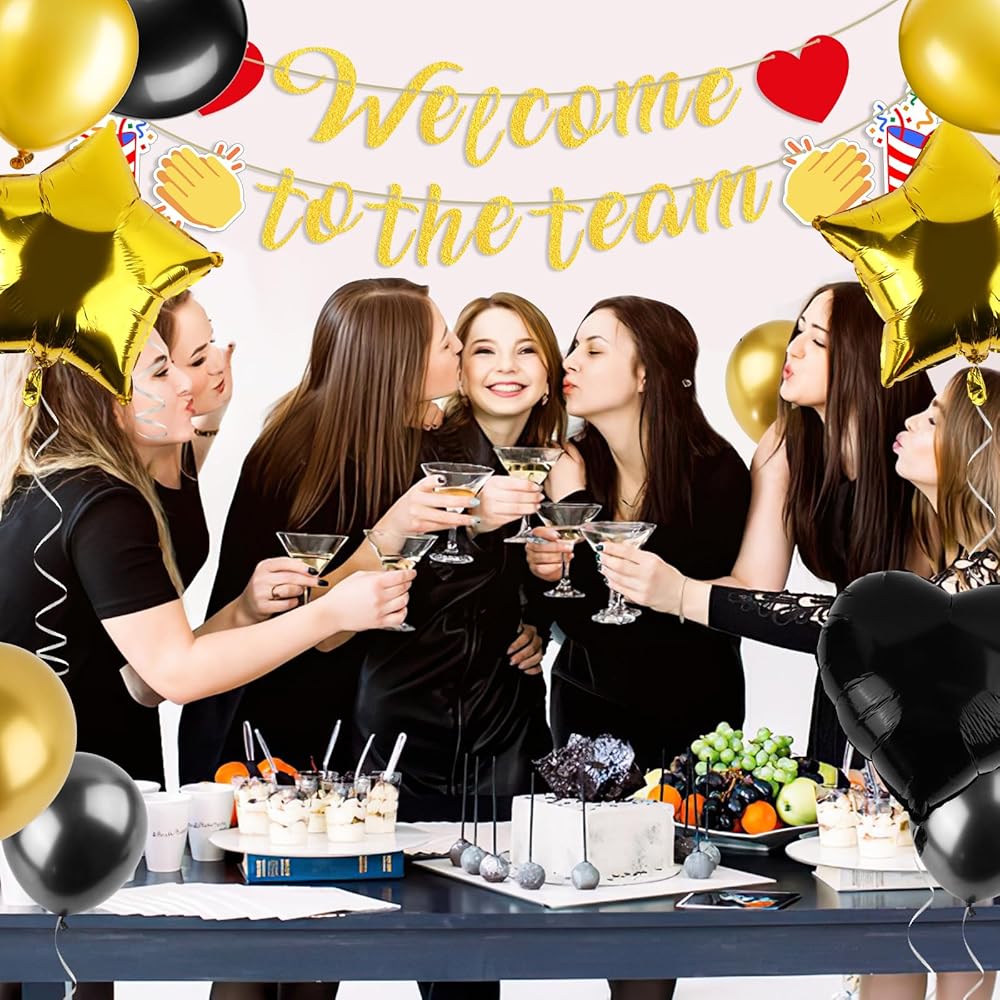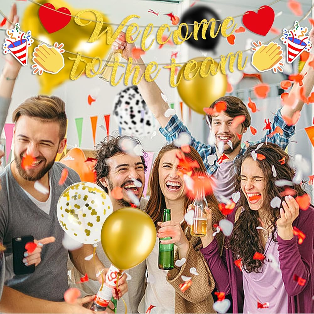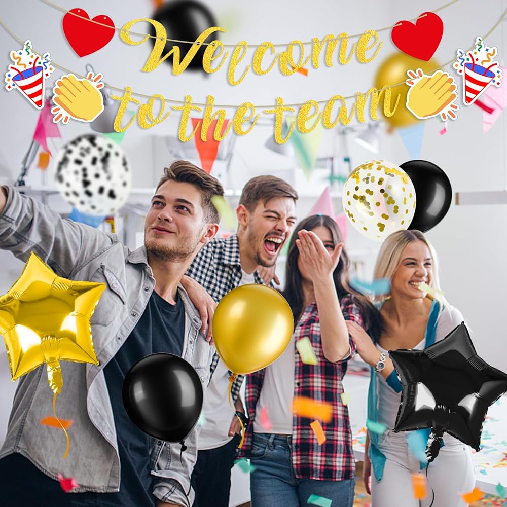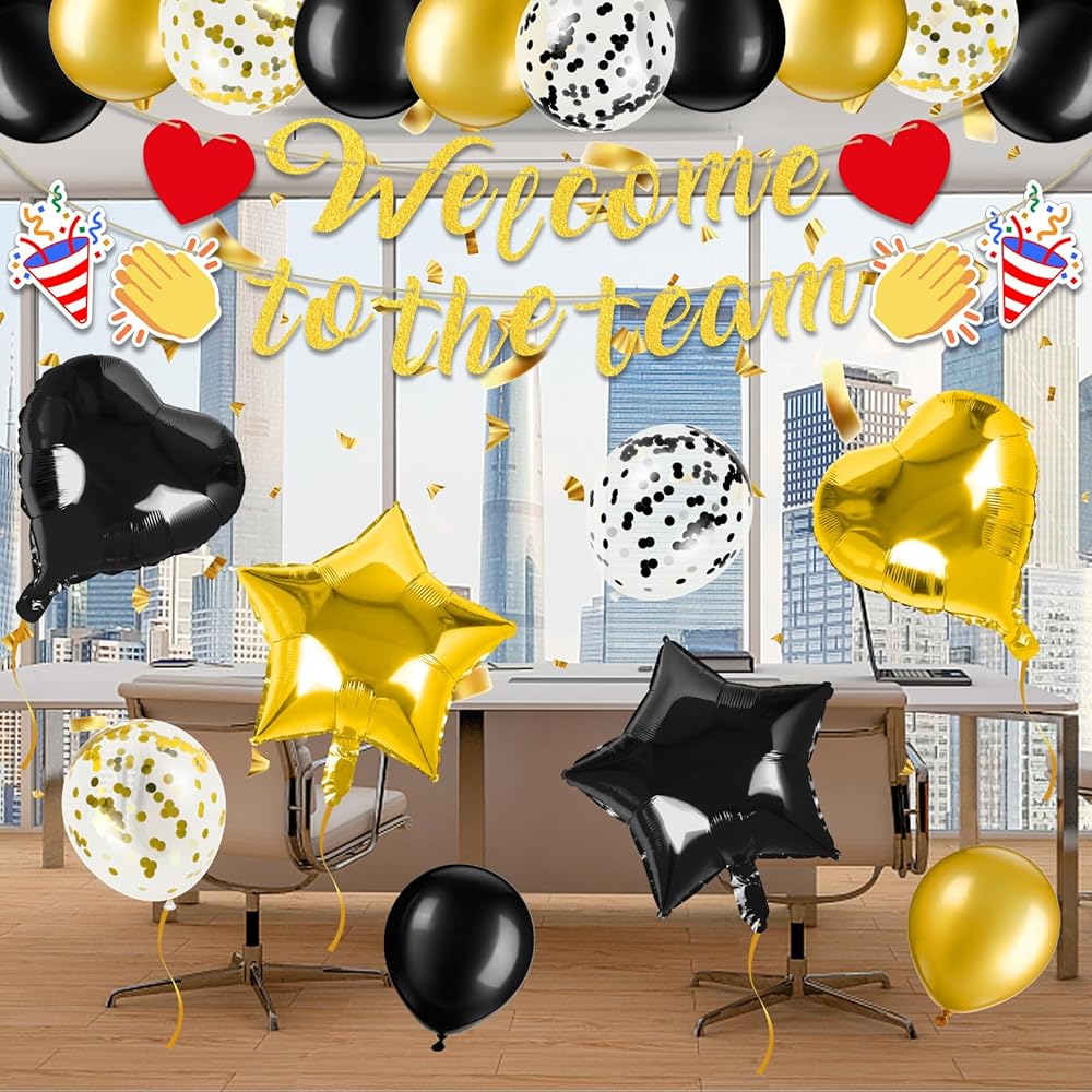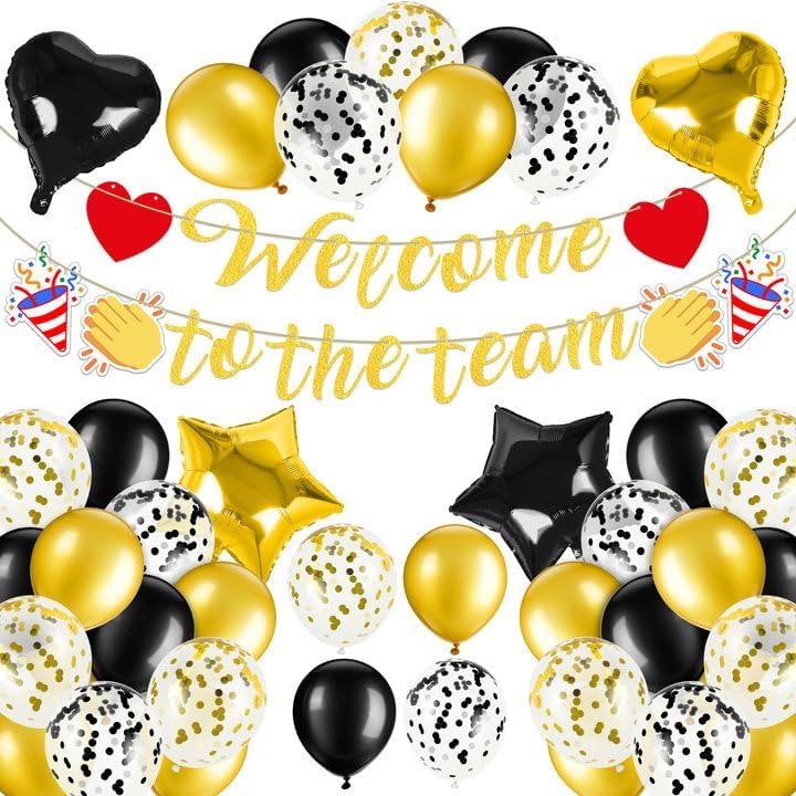 Welcome to The Team Banner: You will receive 1 set of black glitter "Welcome to the team" banner with 2 x red hearts, 2 x fireworks and 2 x clapping graphics; 24 x balloons (5 x black + 5 x gold + 5 x Golden confetti + 5 x black confetti + 2x hearts + 2x five-pointed star balloons); you will definitely like it.