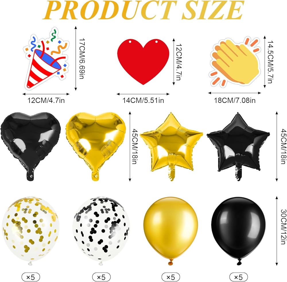 Materials and Size: Latex balloons are made of high-quality materials. Banners and cards are made of high quality card stock.The size of the heart-shaped balloon and the five-pointed star balloon is 45cm/18in; the size of the round balloon is 30cm/12in; the size of the firework card is 17cm/6.7in; the size of the red heart card is 12cm/4.7in; the applause card The dimensions are 14.5cm / 5.7 inches.
