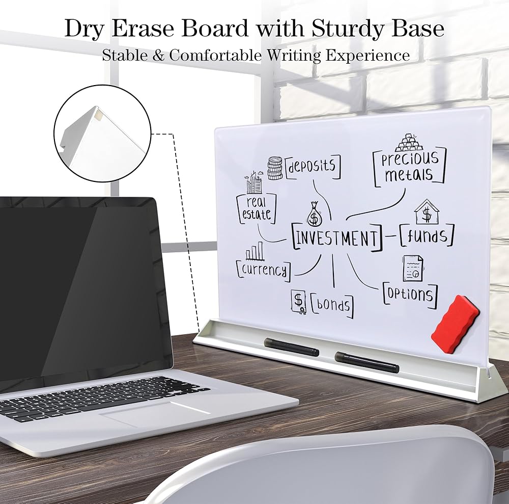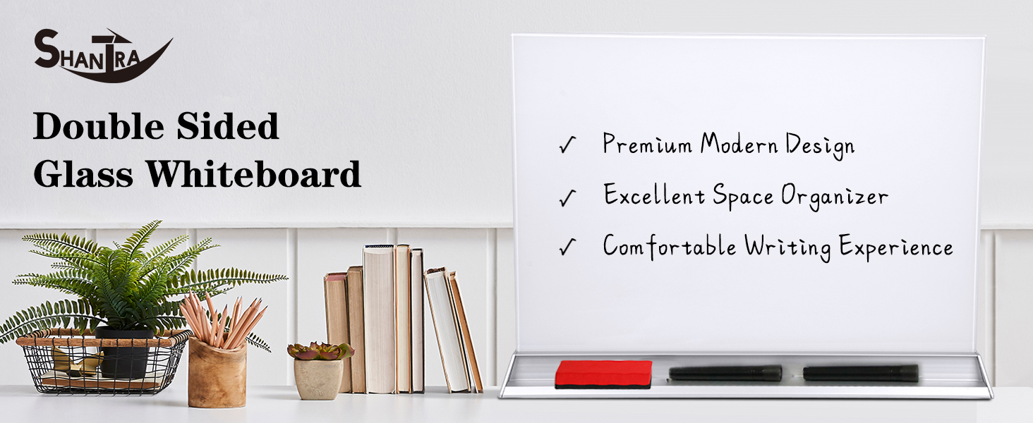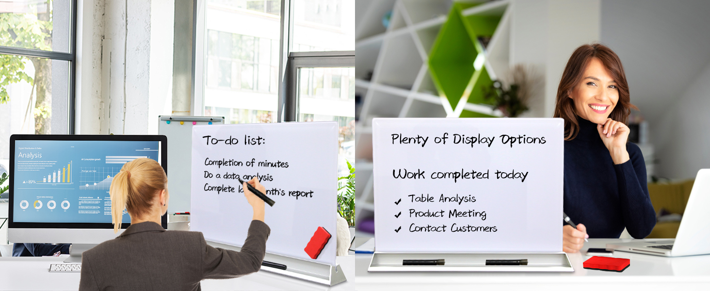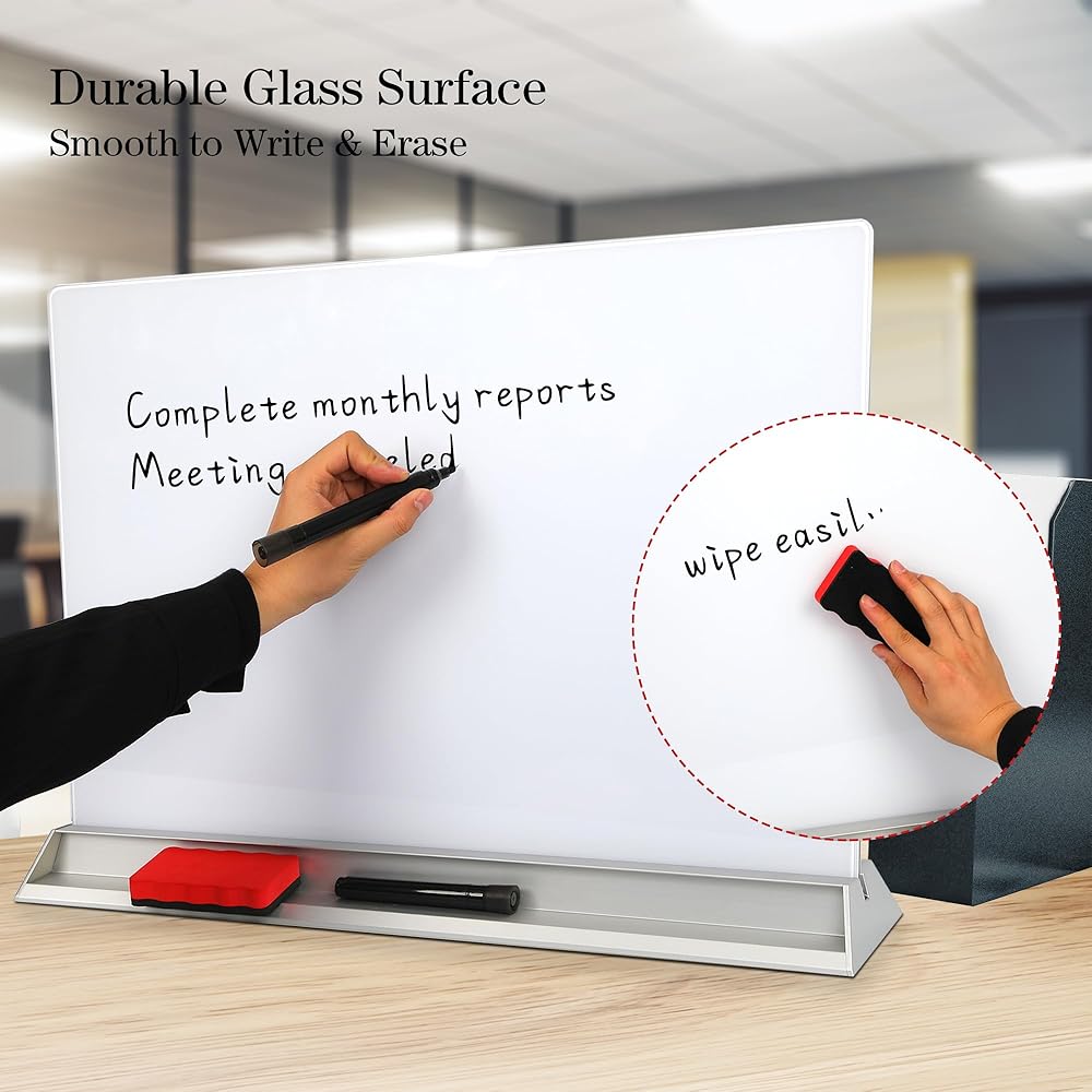 【مساعد سطح المكتب】: يمكن للوحة البيضاء الزجاجية ذات الوجهين مقاس 23 بوصة × 17 بوصة أن تزيد من مساحة الكتابة الخاصة بك ويتيح لك السطح الزجاجي الناعم الكتابة والمسح بسهولة مرارًا وتكرارًا. وفي الوقت نفسه، فإن فتحاتها المزدوجة ملائمة لسهولة تخزين اللوازم المكتبية.