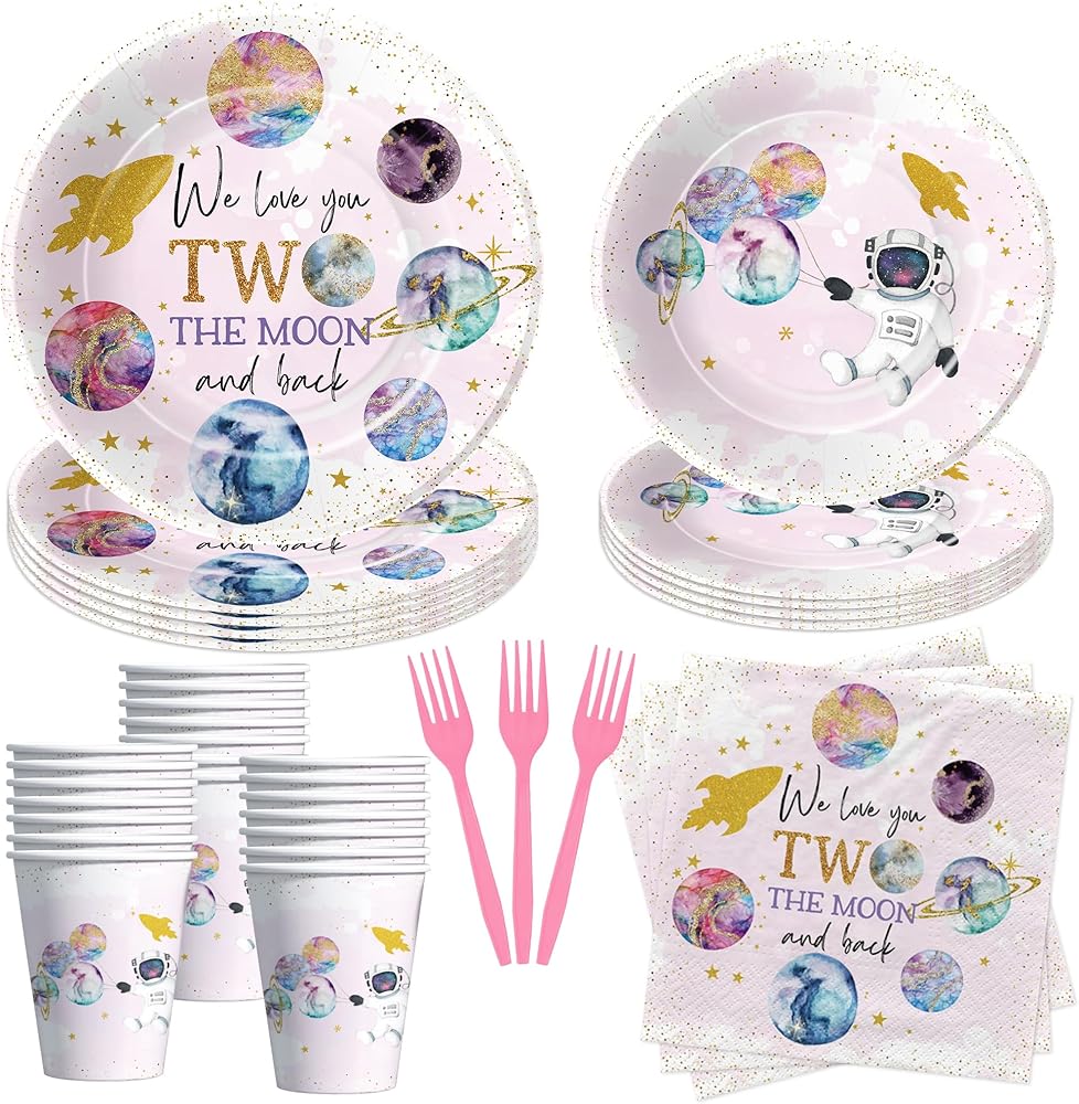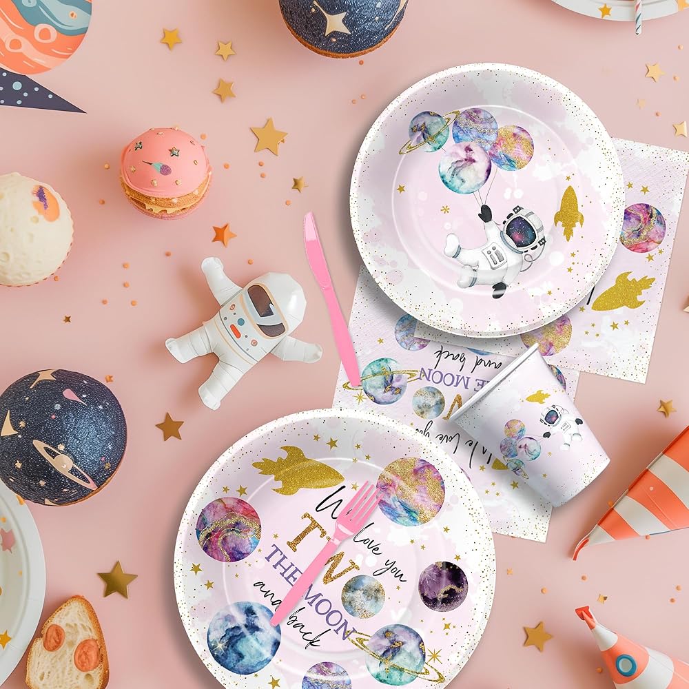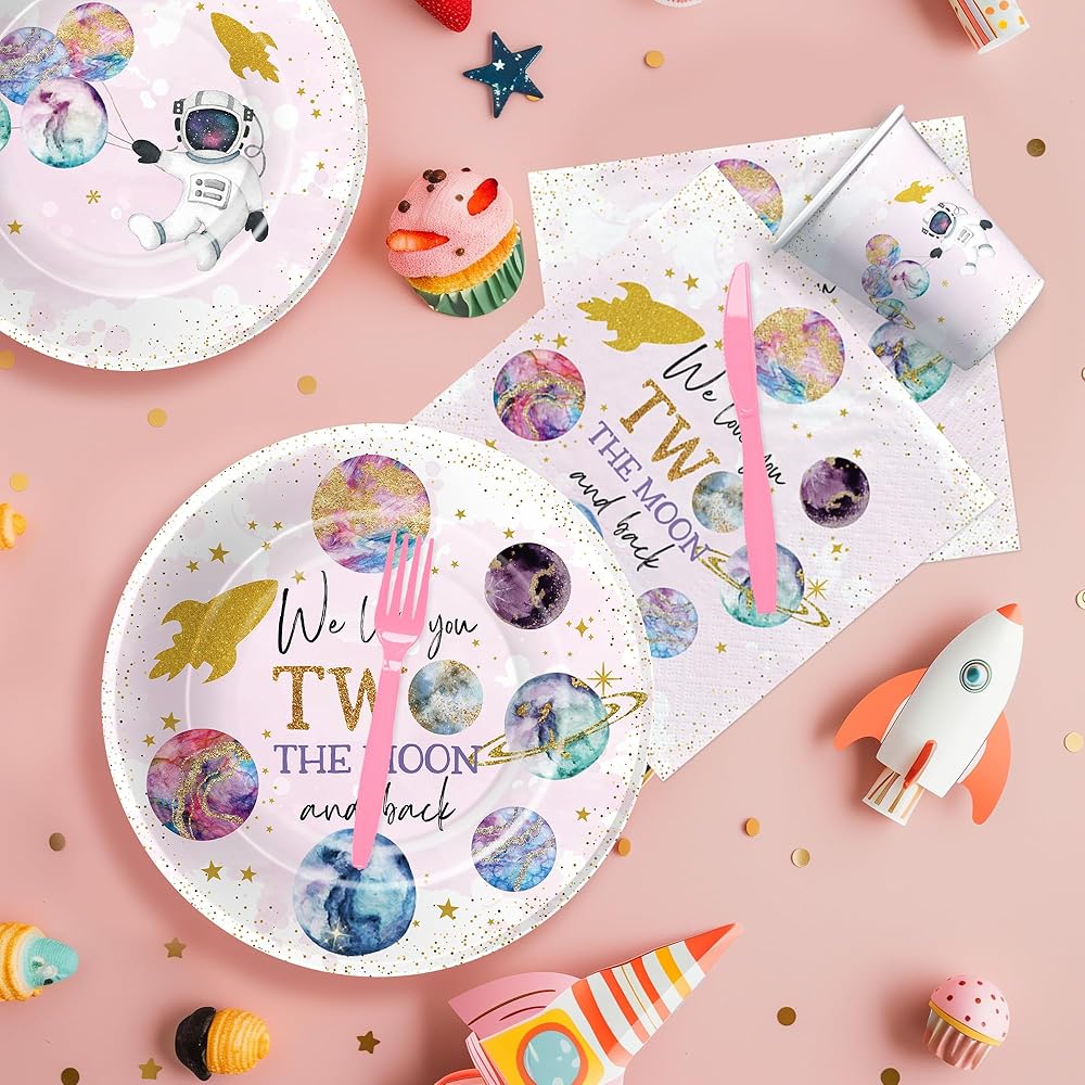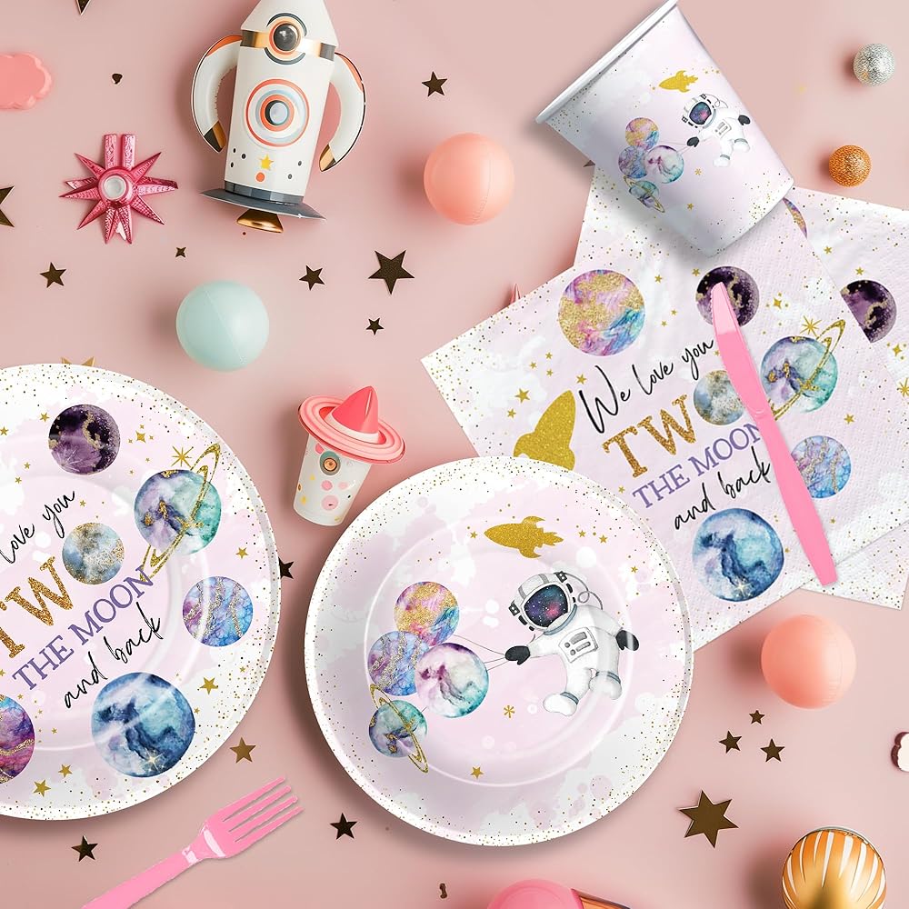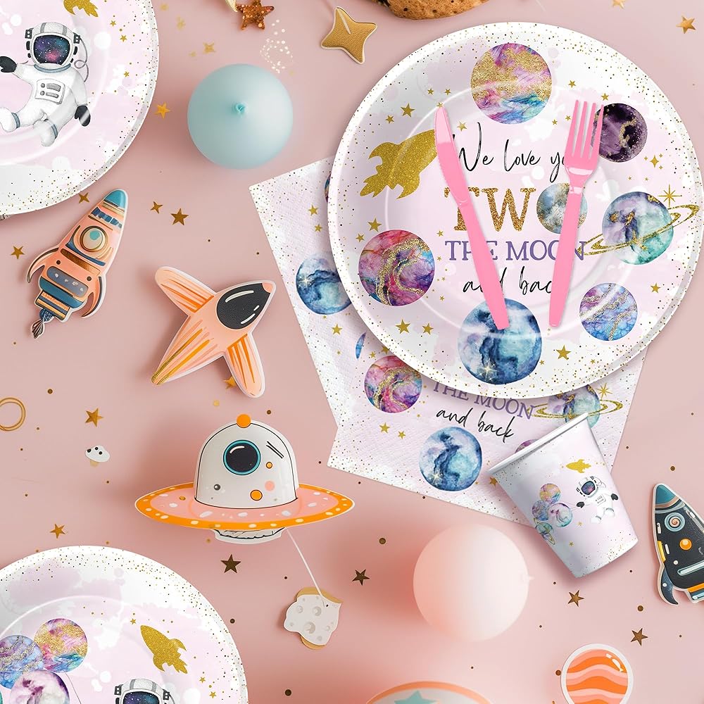 【Pink Space 2nd Birthday Supplies】 Space 2nd Birthday party decorations girl tableware features a charming, celestial-themed design with adorable elements like stars, moons, and planets, perfect for adding a touch of magic to your little girl's birthday celebration