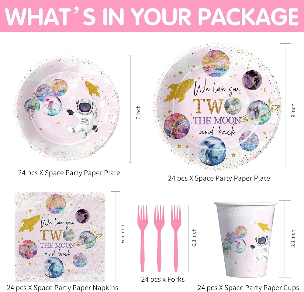 【What Will You Get】Our girl's space theme two the moon birthday table decorations tableware set includes 24pcs 9'' two the moon dinner plates, 24pcs 7'' outer space dessert plates, 24pcs paper napkins, 24pcs party cups, 24 sets of disposable cutlery, for little girl space theme second birthday party decorations