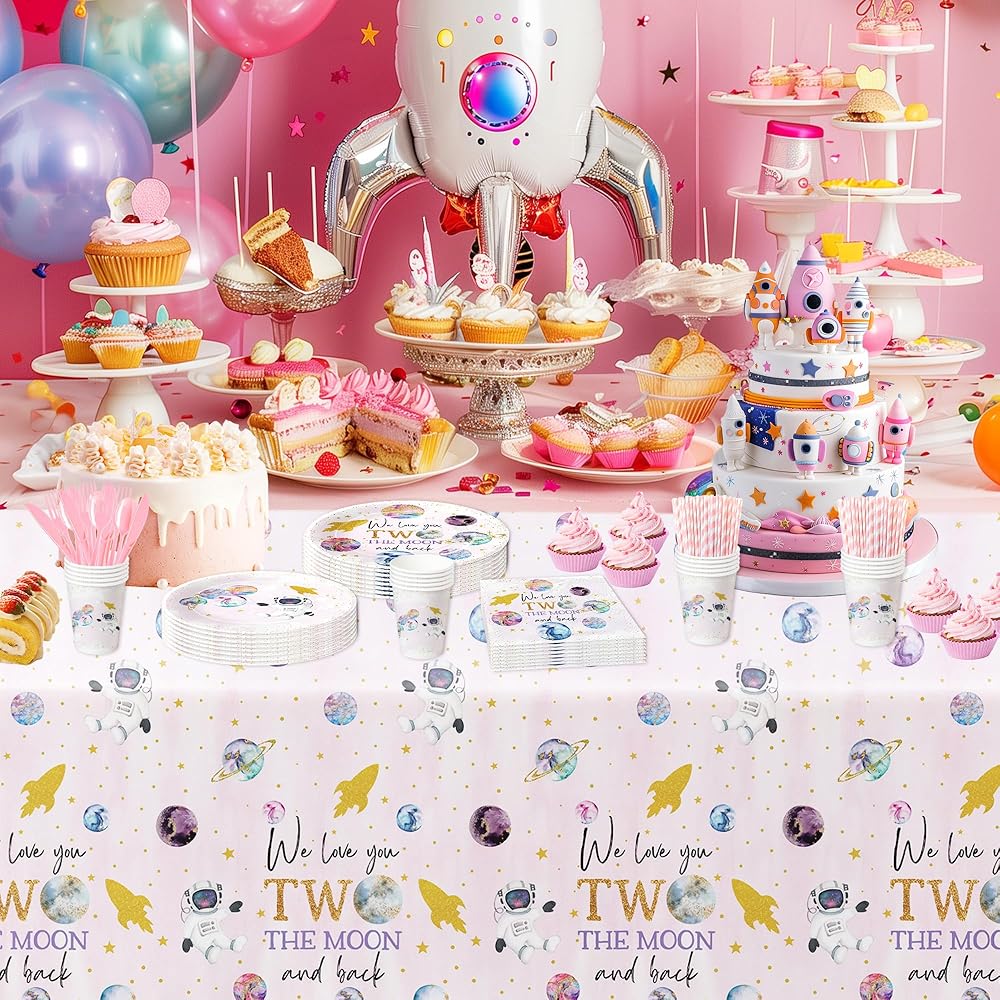 This all-in-one pink two the moon birthday table decorations set is an excellent purchase of space theme decorations for 2nd birthday