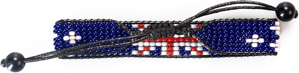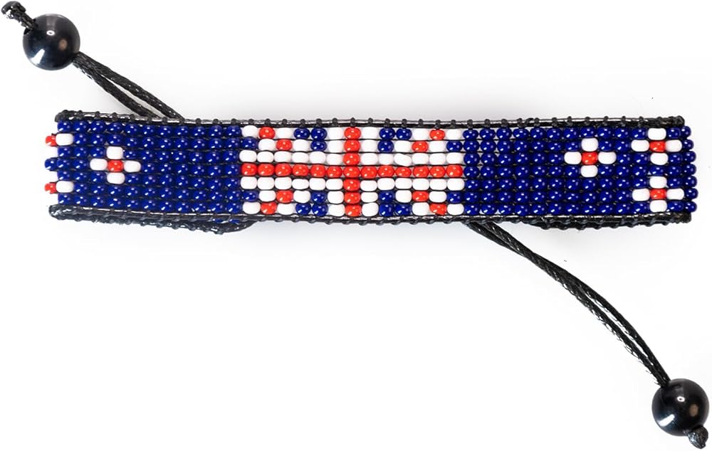 This adjustable handmade bracelet celebrates New Zealand heritage. Crafted from colorful beads in the iconic pattern of the New Zealand flag, this bracelet makes a bold yet understated style statement. An adjustable cord allows it to fit wrists of different sizes so it can be shared or worn year-round. Lightweight and versatile, it pairs well with casual or dressy outfits for a pop of color. Wear it to show your Kiwi pride or as a conversation starter to share your cultural background. The intricate beading is done by hand, so each piece has its own unique texture and charm.