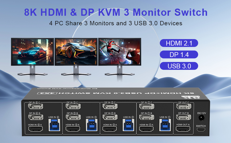 【3 شاشات KVM 4 دعم الكمبيوتر فائق الدقة 8K@60 هرتز】 3 شاشات KVM Switch DisplayPort: دعم دقة تصل إلى 8K@30 هرتز/4K@144 هرتز. 3 شاشات KVM Switch HDMI: يدعم دقة تصل إلى 8K@60هرتز/4K@60هرتز/2K@60هرتز ومتوافق مع الإصدارات السابقة بدقة أقل. ملحوظة: الدقة النهائية تخضع أيضًا لبطاقات الرسومات والشاشات والكابلات والمحولات.