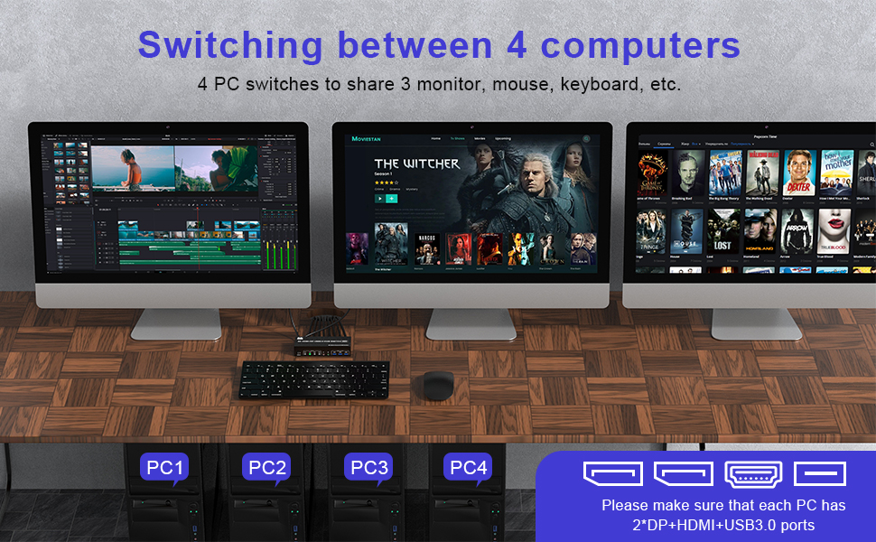 【ملاحظة: يحتاج كل جهاز كمبيوتر إلى توصيل كابل 2*DP+1*HDMI+1*USB 3.0 للحصول على عرض ثلاثي الشاشات بشكل صحيح. ستكون هناك حاجة إلى محولات إذا كان جهاز الكمبيوتر الخاص بك لا يحتوي على 2*DP+1*منافذ HDMI. يدعم محول KVM المكون من 4 أجهزة كمبيوتر و3 شاشات استخدام مجموعة متنوعة من المحولات وقاعدة الشحن، مثل DP إلى HDMI، وHDMI بالطاقة إلى DP، وMINI DP إلى DP، ومحول USB C إلى DP/HDMI ومحطة شحن USB C.