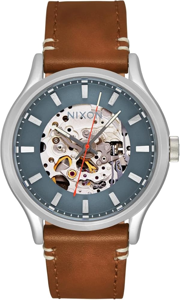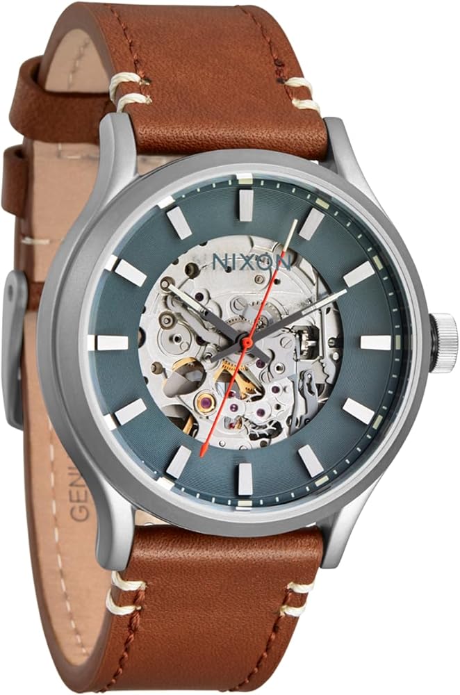 The Spectra Leather sits exquisitely between defying tradition and paying homage to the classic art of watchmaking. Its twenty-one jewel automatic movement is fully displayed through the spectacular transparent skeleton face, punctuated by striking indices and the Nixon wordmark that appears to float above it all. It's daring, dimensional, and drops jaws anywhere it goes.