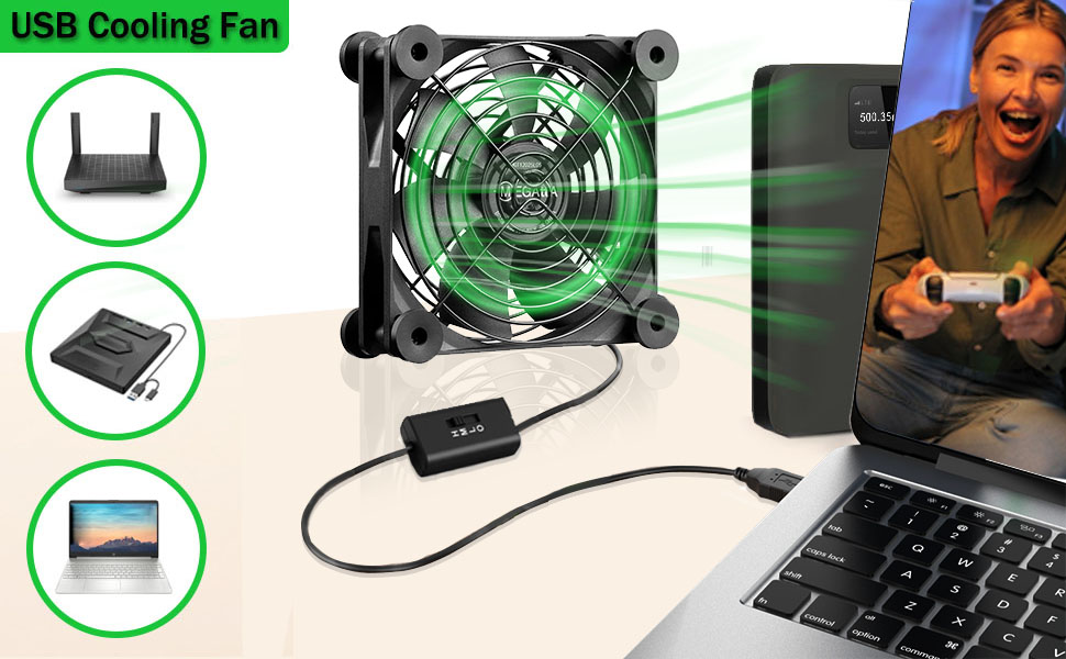 سهولة الاستخدام، قابلة للتطبيق على نطاق واسع - يمكن العثور على منفذ USB 5 فولت خلف معظم الأجهزة الإلكترونية أو ببساطة لاستخدام شاحن مع منفذ USB. قم بتبريد الأجهزة الإلكترونية والمكونات المختلفة، مثل Raspberry، وPlaystation، وXbox، وMini PC، والقرص الصلب الخارجي، ومعدات السينما المنزلية، وTV Box، وLaptop، وPVR، ووحدات التحكم في الألعاب، ومودم الألياف، وبوابة الإنترنت، وNAS...