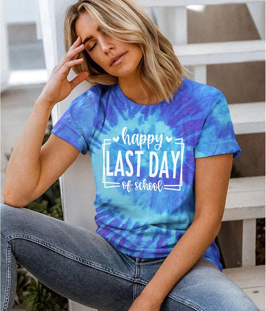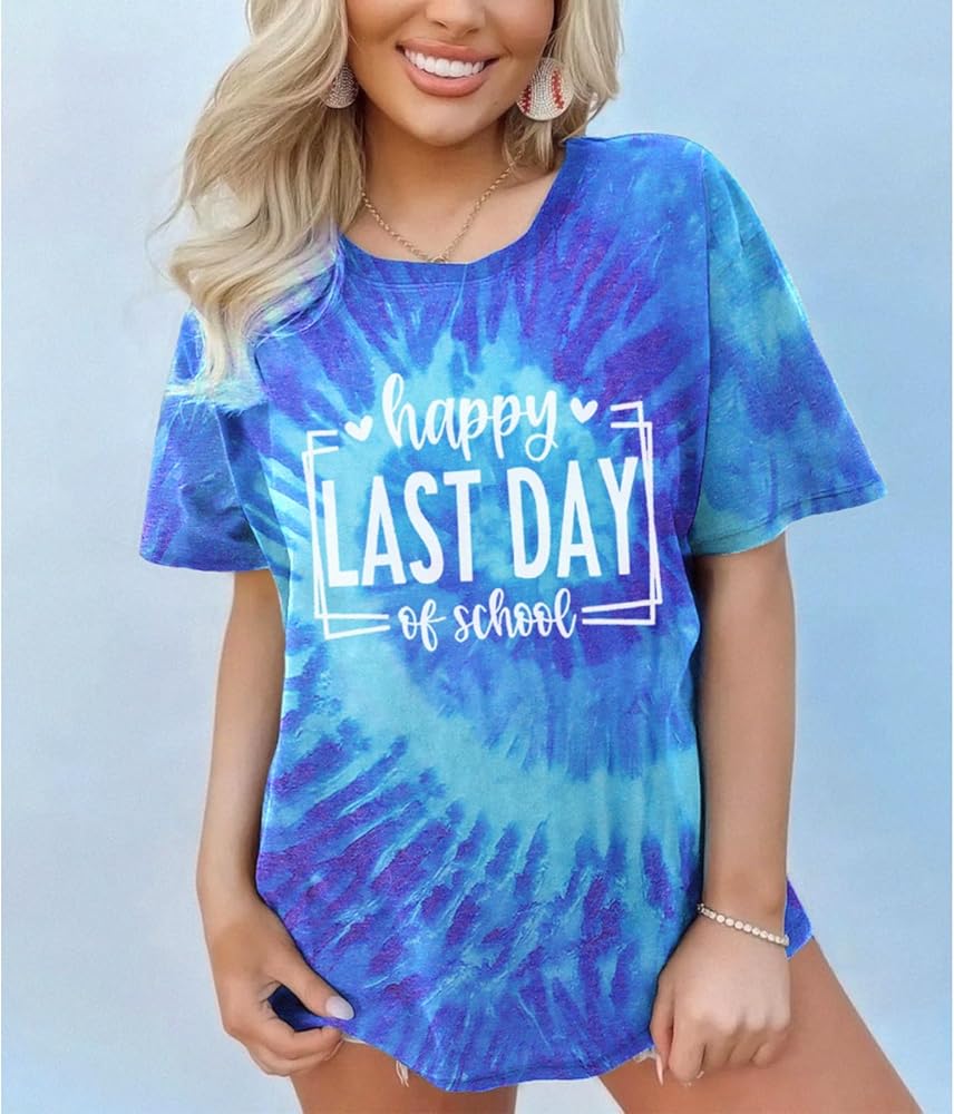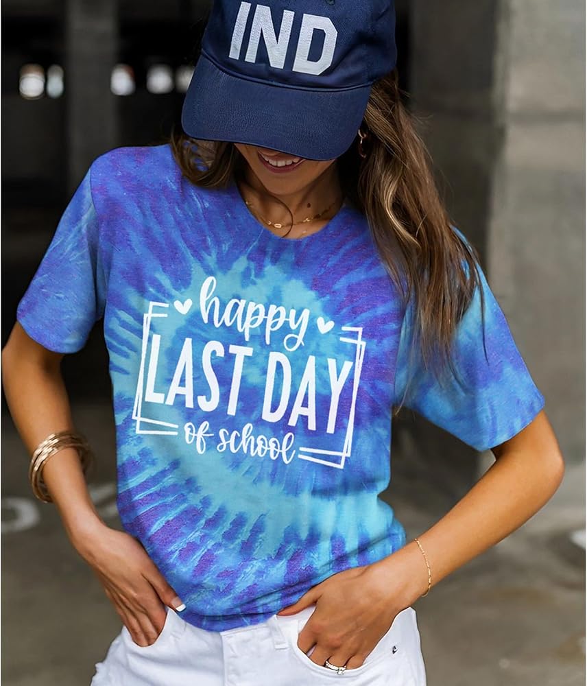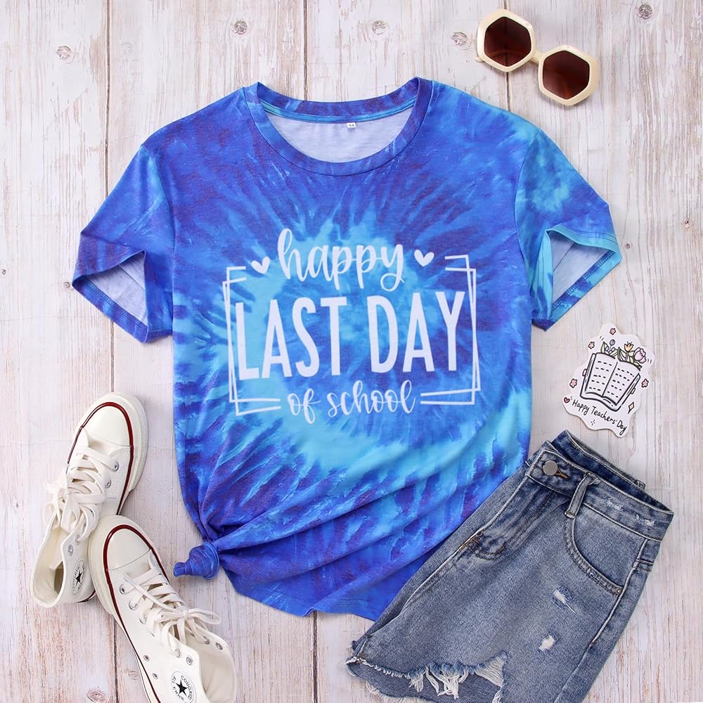 【المميزات: تي شيرت التخرج المدرسي للسيدات مثالي للاحتفال بنهاية العام، برقبة دائرية، وتصميم بأكمام قصيرة، ومطبوع عليه حرف "Happy Last Day of School" الممتع. أظهر حبك للتدريس مع تي شيرت Teacher Life الخاص بنا.