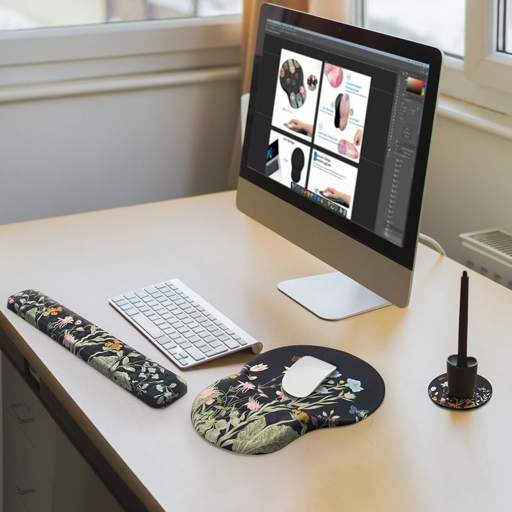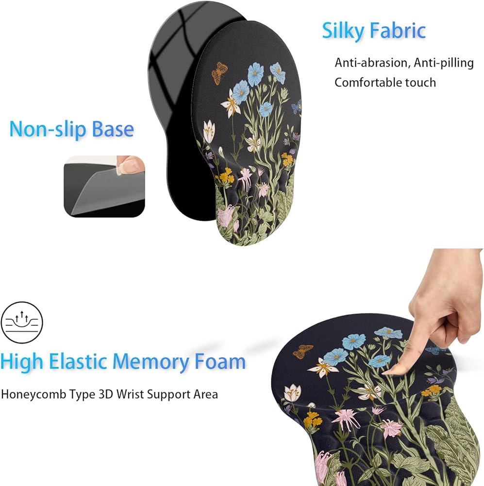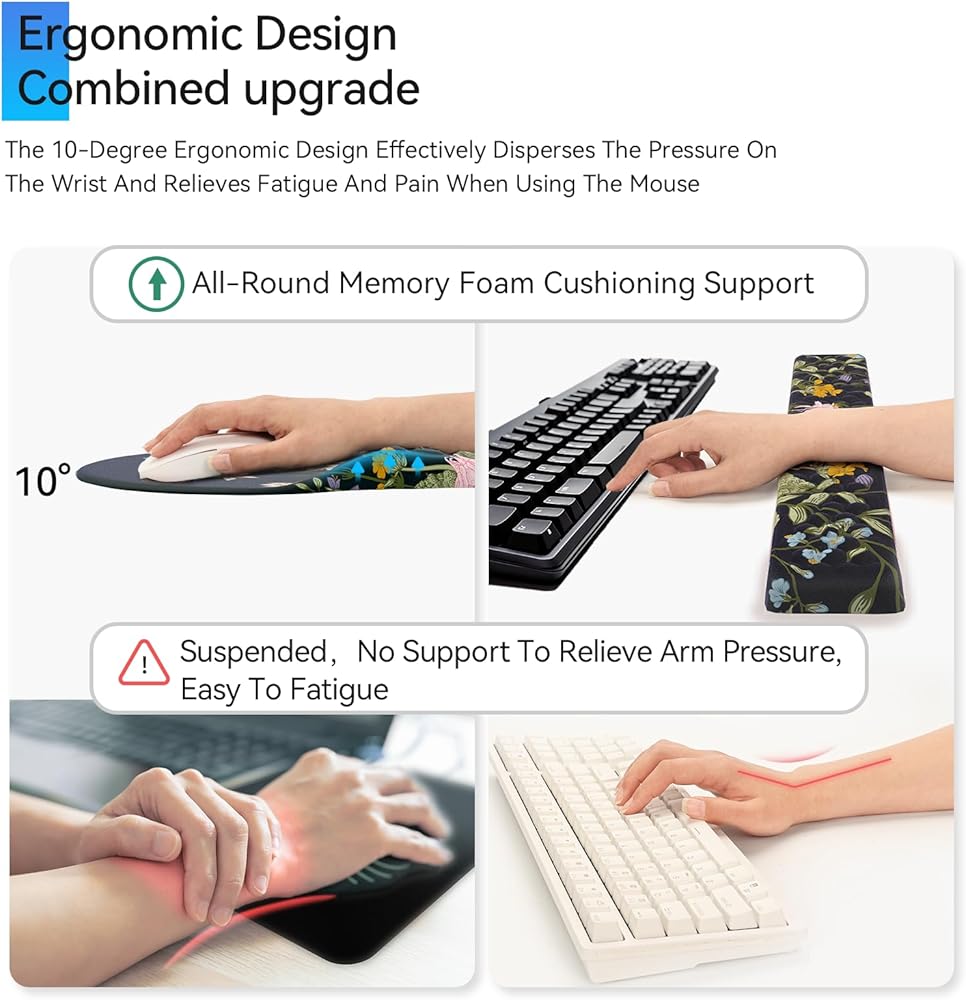【تصميم مريح】توفر مجموعة لوحة الماوس ومسند المعصم المبتكرة دعمًا ثابتًا، بينما توفر منطقة دعم المعصم ثلاثية الأبعاد من نوع قرص العسل تدليكًا للمعصم لتقليل الألم والضغط، مما يحافظ على معصمك في حالة أكثر راحة لفترات طويلة من العمل والكتابة.