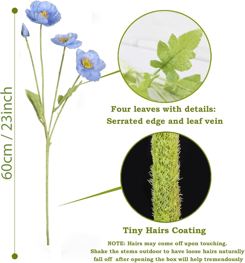 🌺 تأثير واقعي 🌺 لتقليد الخشخاش الحقيقي، يتم إضافة قطيع إلى سيقان وأوراق الخشخاش الحريري للحصول على تأثير واقعي، وبالتالي فإن الاهتزاز سيتسبب في سقوط الزغب قليلاً، وهي ظاهرة طبيعية، ولا تؤثر على المظهر والاستخدام. البتلات ناعمة ونابضة بالحياة، ويختلف شكل الزهرة، فمنه البرعم والأزهار المتفتحة المختلفة.