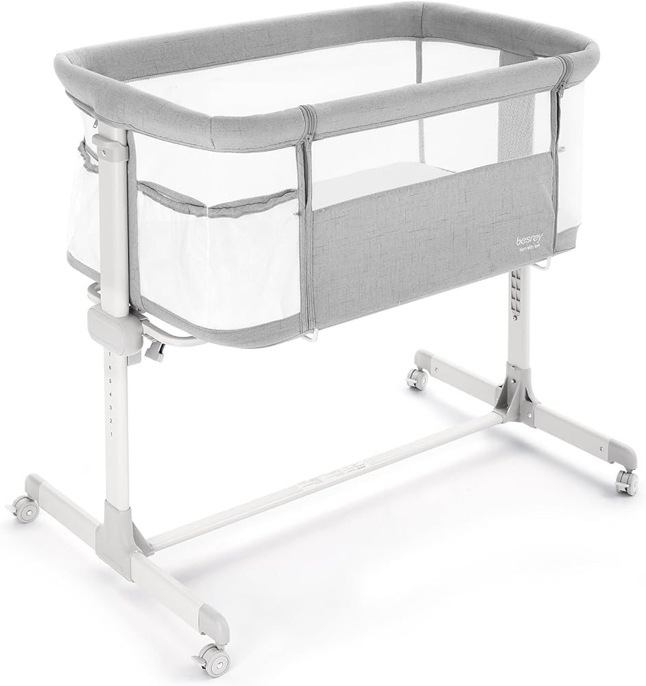 سرير أطفال بجانب السرير من besrey، سرير شبكي بالكامل بجانب السرير للرضع حديثي الولادة مع مرتبة مريحة، سرير بجانب السرير قابل للتعديل بـ 7 ارتفاعات مع عجلات دوارة 360 درجة، سرير أطفال للنوم مع جيوب شبكية