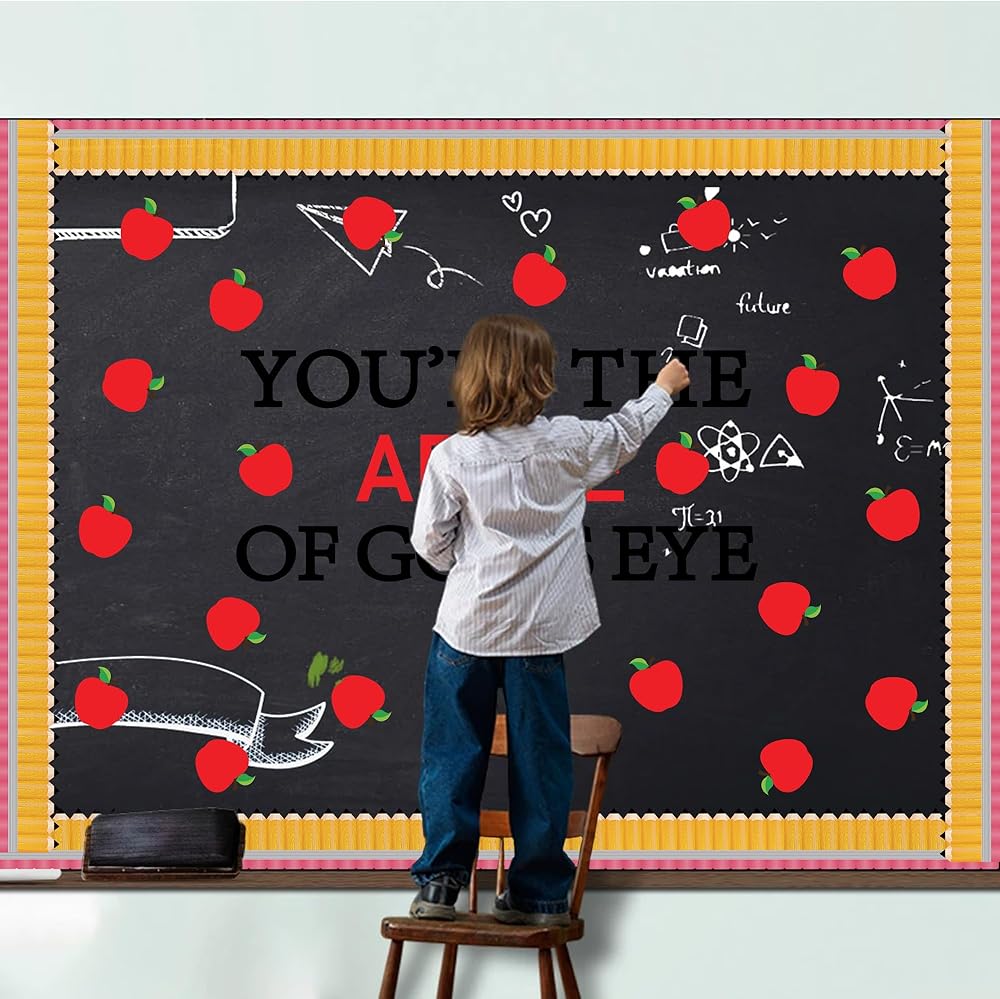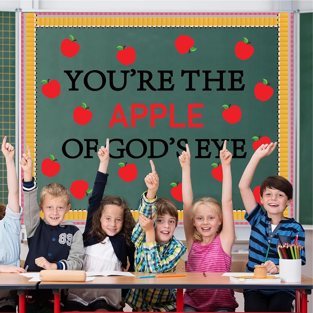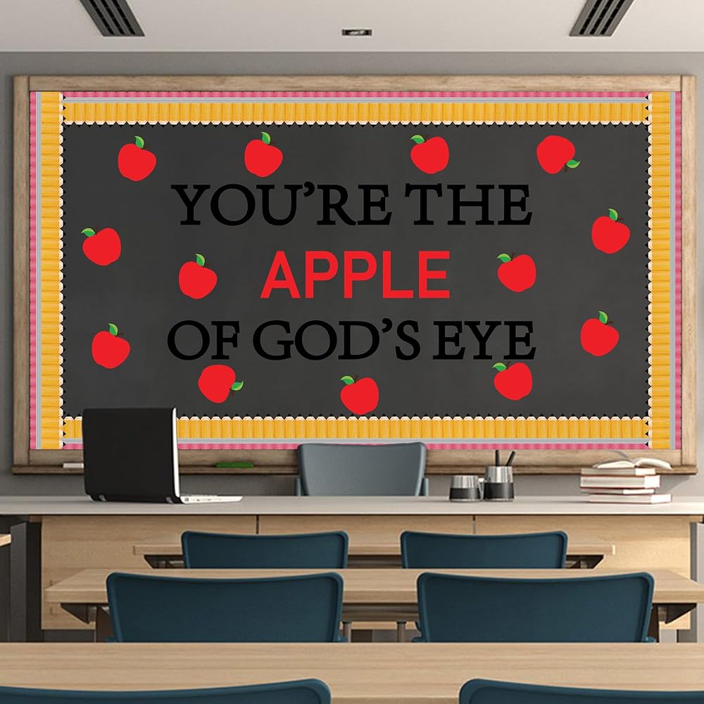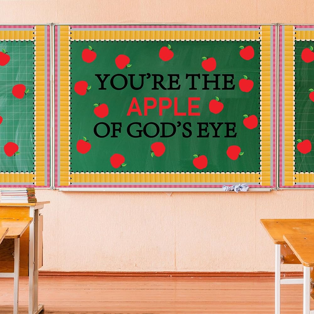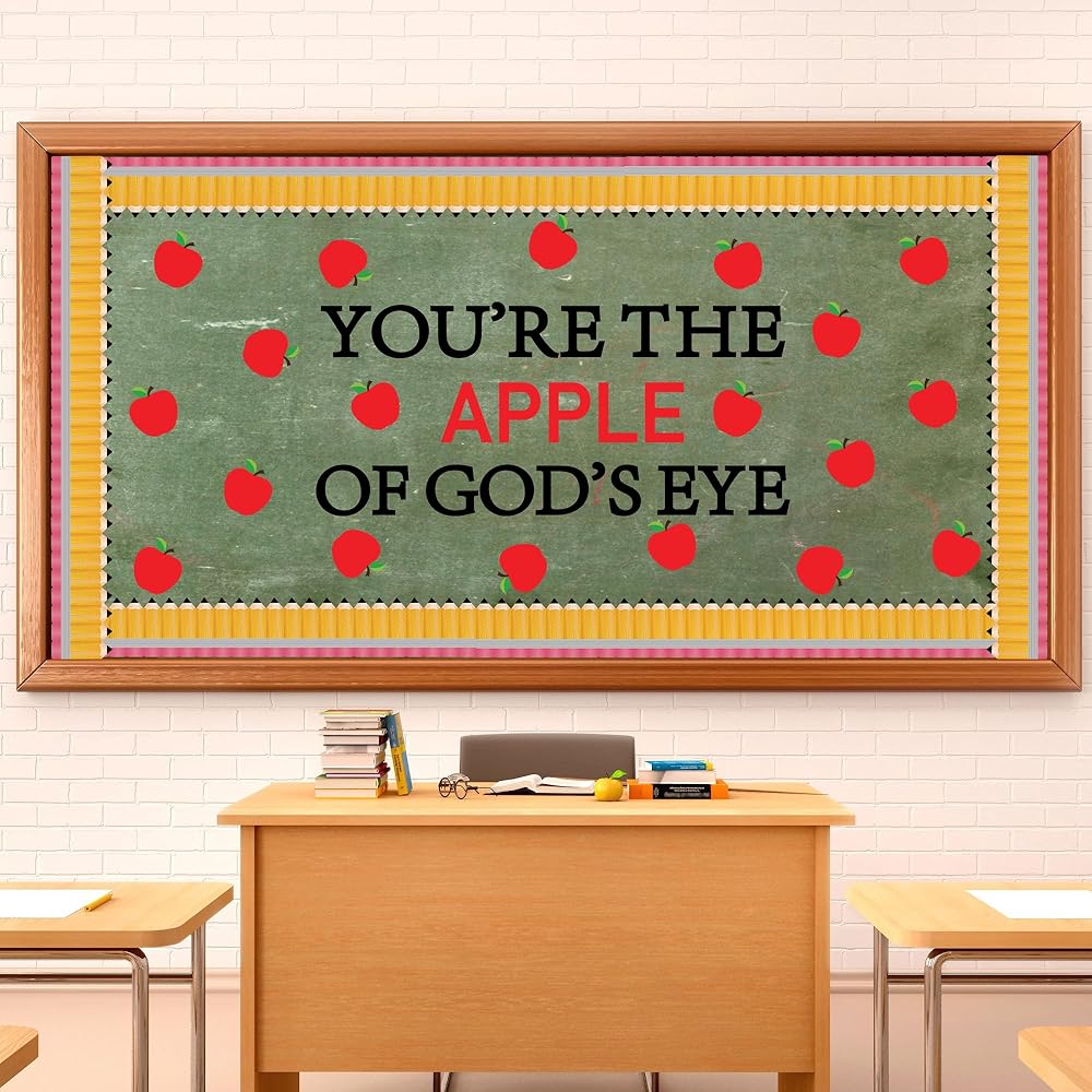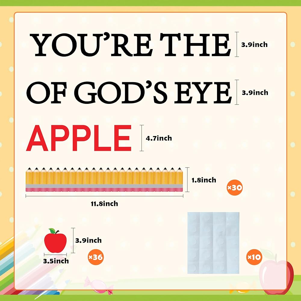 تشمل العبوة: مجموعة ديكورات لوحة الإعلانات للفصل الدراسي للعودة إلى المدرسة تأتي مع 36 قطعة من قطع لوحة إعلانات التفاح، و30 قطعة من حدود لوحة إعلانات القلم الرصاص، و"أنت تفاحة عيون الله" و200 نقطة لاصقة.
