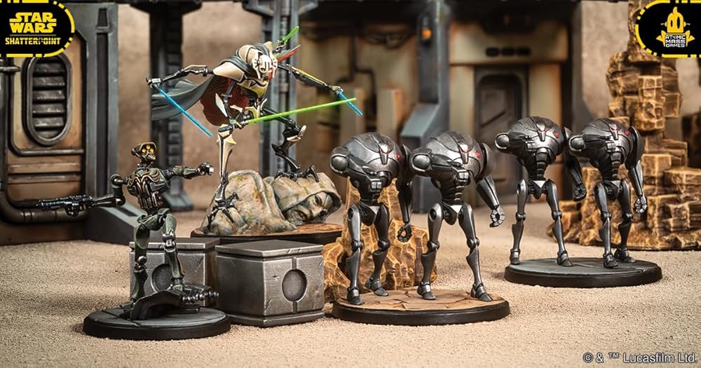 The nefarious General Grievous terrorizes the Republic! Unleashing the Separatist Droid Army throughout the galaxy, Grievous has proven to be more than a match for his Jedi adversaries. A shrewd military strategist, he makes use of brutal tactics to claim numerous victories and instill fear in his opponents. This pack adds a new squad of General Grievous, Kraken, and two B2 Battle Droids to Star Wars: Shatterpoint that players can play right away or use alongside other characters to create their own custom squad. In addition to the beautifully sculpted miniatures of all four characters, players will also find all the stat, order, and stance cards they need to bring these characters to life on the tabletop.