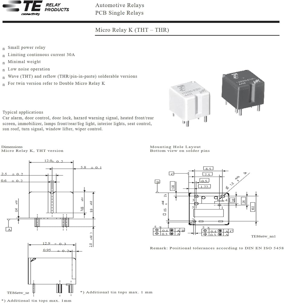 • The V23086-C1001-A403 12VDC Automotive Relays are designed to provide reliable and efficient performance in various applications such as car alarms, door control, door locks, hazard warning signals, and more.