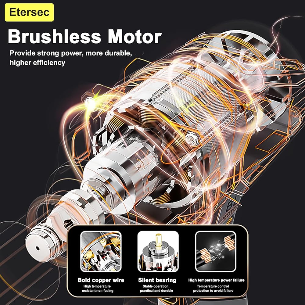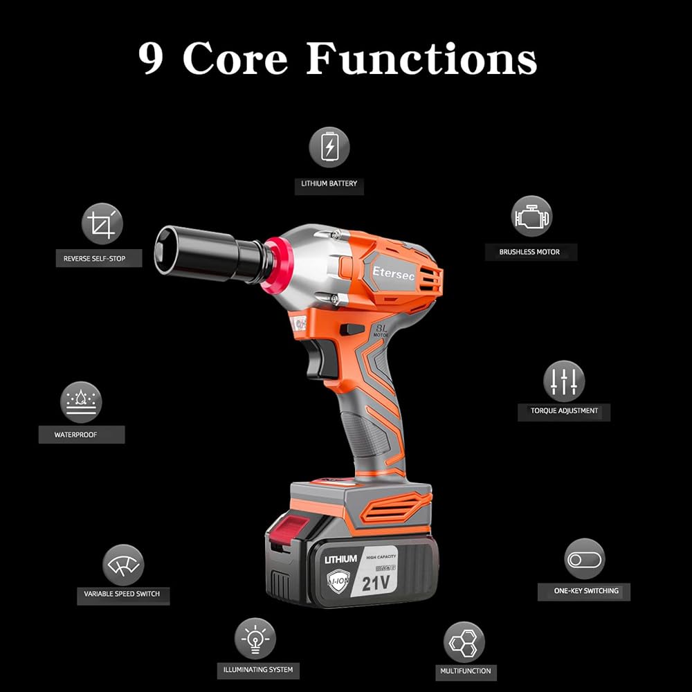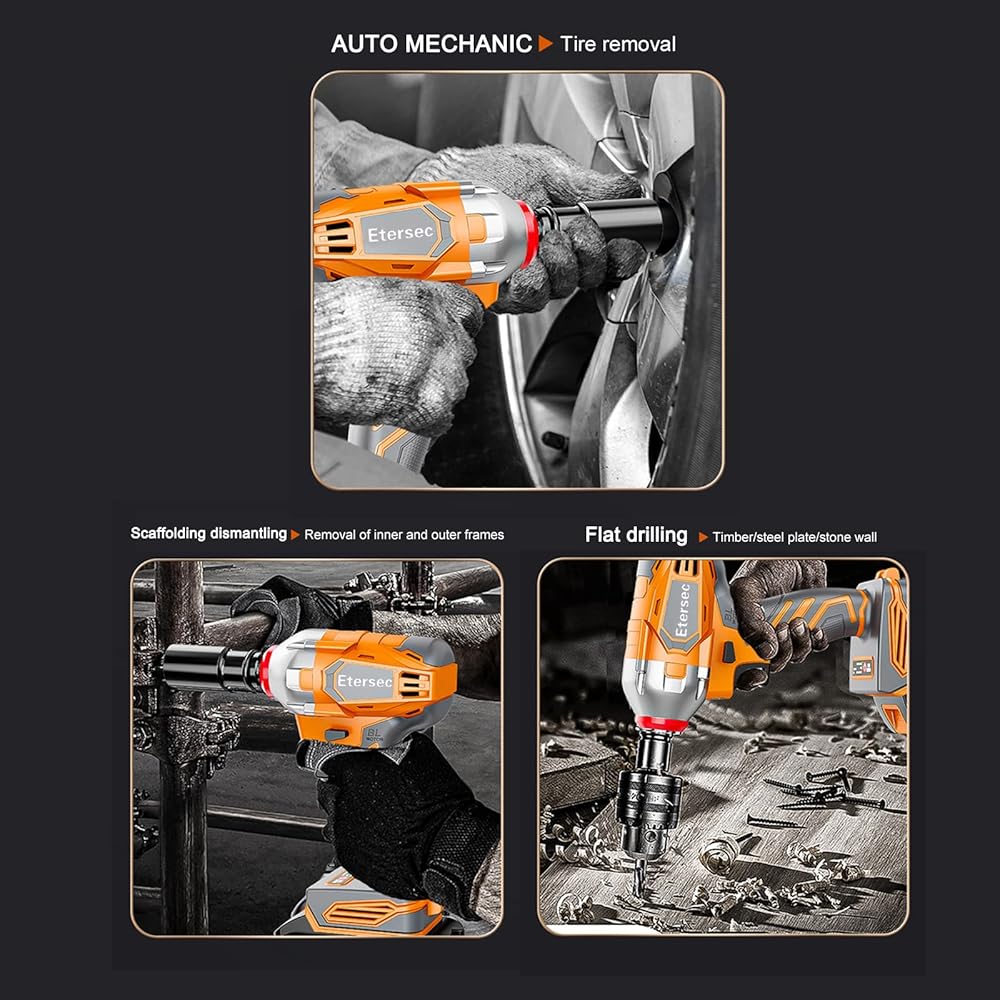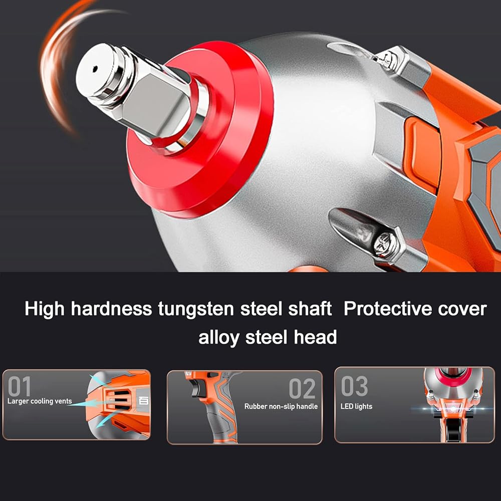 • Brushless motor, powerful torque, provides super power: High torque impact spanner high power motor provides super high speed for the machine, thickened copper wire, high temperature resistance without melting, silent bearing, low noise, stable endurance, high temperature melting to avoid failure. Powerful torque equivalent to 23 adult males firing together, twisting power tight demolition fast, high efficiency!