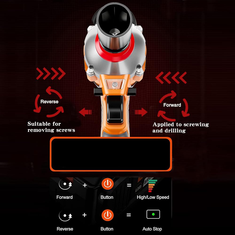 • Forward and reverse mode, high safety performance: forward mode + function button, adjust the torque size, suitable for screwing and drilling; reverse mode + function button, open the self-stop function, suitable for removing screws.