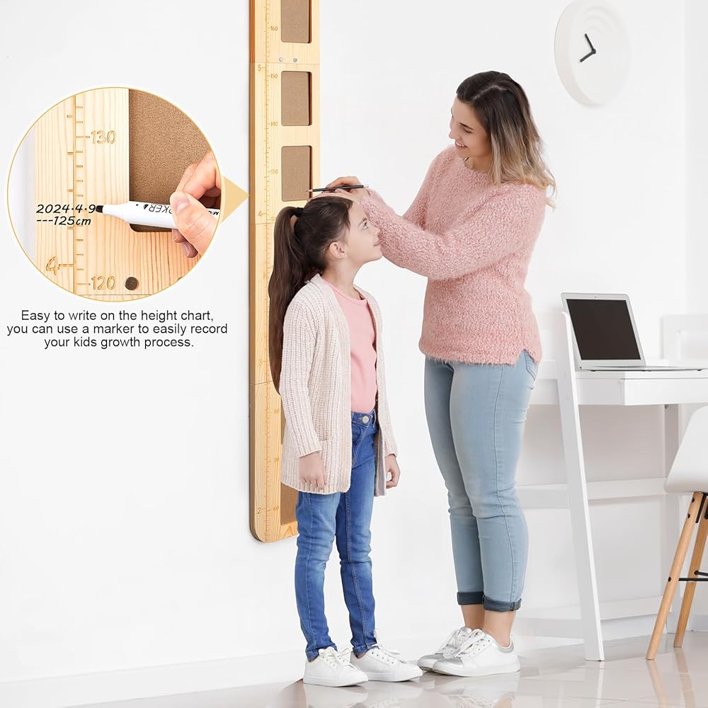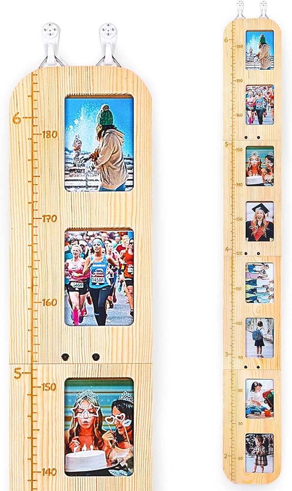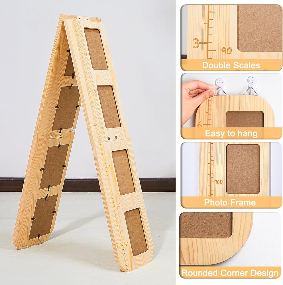 خامة عالية الجودة: مصنوعة من خشب عالي الجودة، مع 4 ألواح خشبية، كل منها لها ملمس خشبي طبيعي فريد. يمكن إعادة استخدام قياس الارتفاع للجدار، وليس من السهل كسره، مع خطاف لسهولة تحريكه.