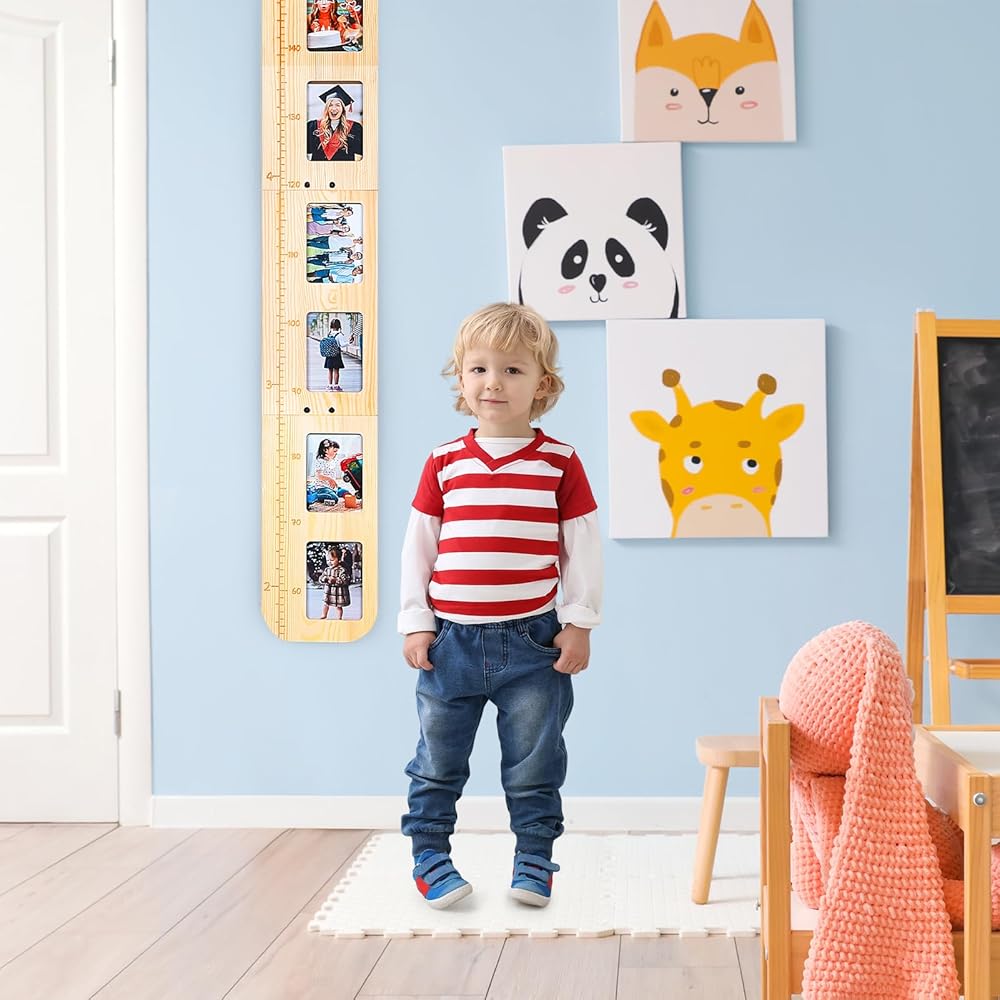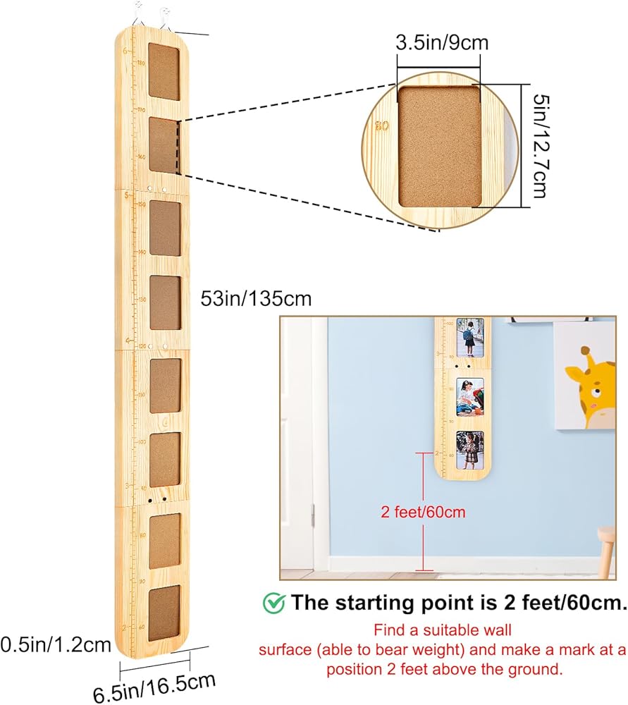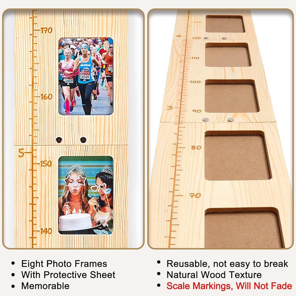 مخطط نمو الخشب مع إطارات الصور: يحتوي مخطط الارتفاع للأطفال على 8 إطارات صور حيث يمكنك عرض الصور وتسجيل الذكريات، والحفاظ على ذكريات نمو أطفالك. إطار الصورة لحجم مخطط النمو هو 3.5 بوصة * 5 بوصة، وهو حجم شائع، والإطارات بها أغطية واقية لحماية الصور.