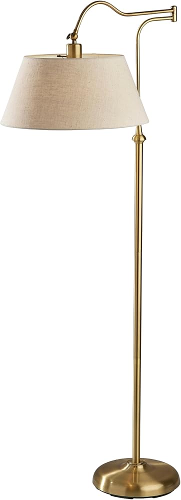 With a touch of urban edge, the Rodeo floor lamp modernizes the traditional bridge lamp, giving it an adjustable swing arm in addition to a curved pole. The swing arm rotates horizontally, while the shade can be adjusted vertically and secured with a locking key joint, allowing you to direct the light wherever it's needed. A textured cream colored drum shade brightens the design, softly distilling the light from a 150W bulb, while the antique brass finish adds mid-century modern flair. A 3-way rotary socket switch provides a variety of lighting options, allowing you to easily adjust the brightness between low, medium, and high. Complete your décor with the coordinating Rodeo table lamp.