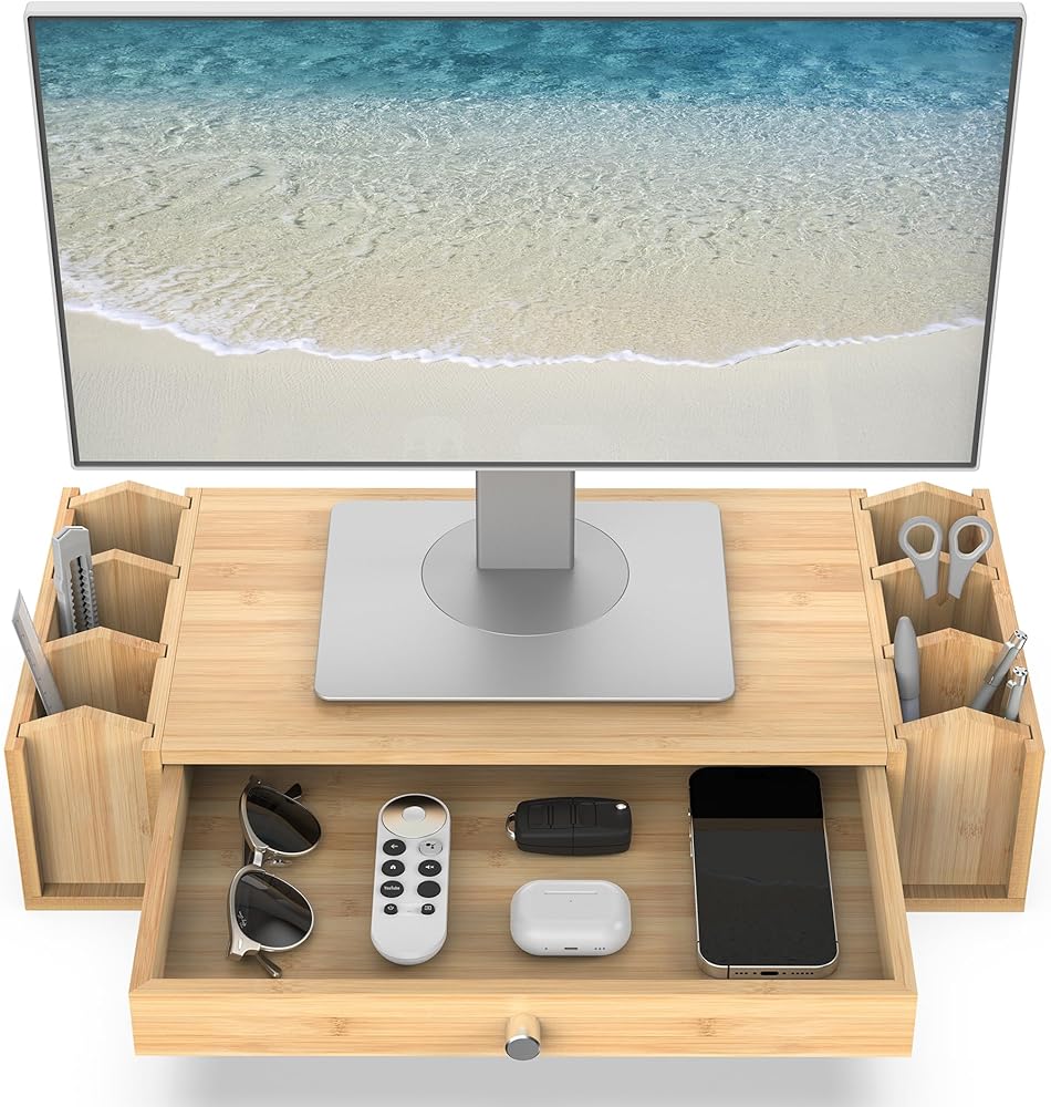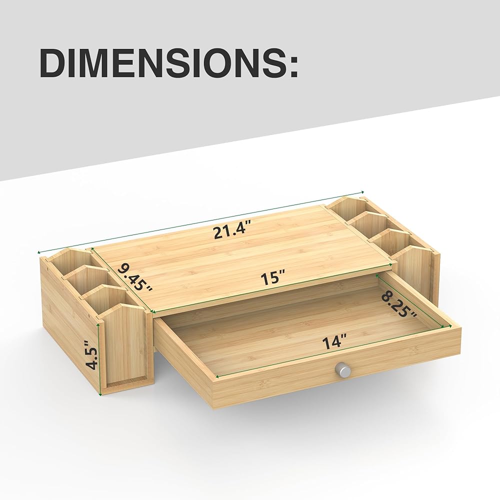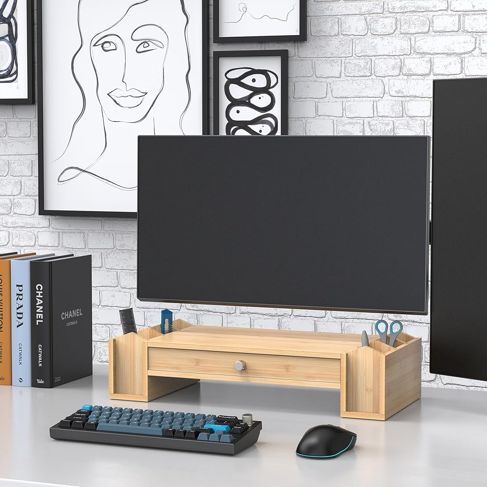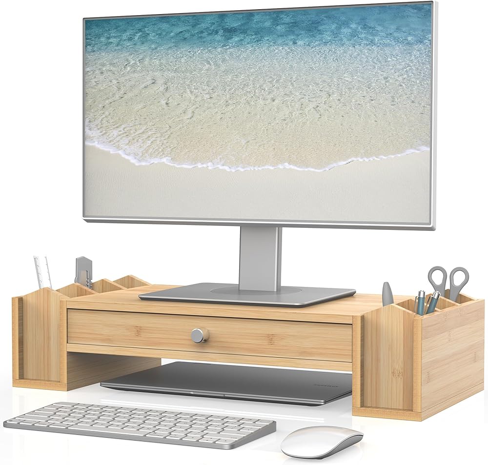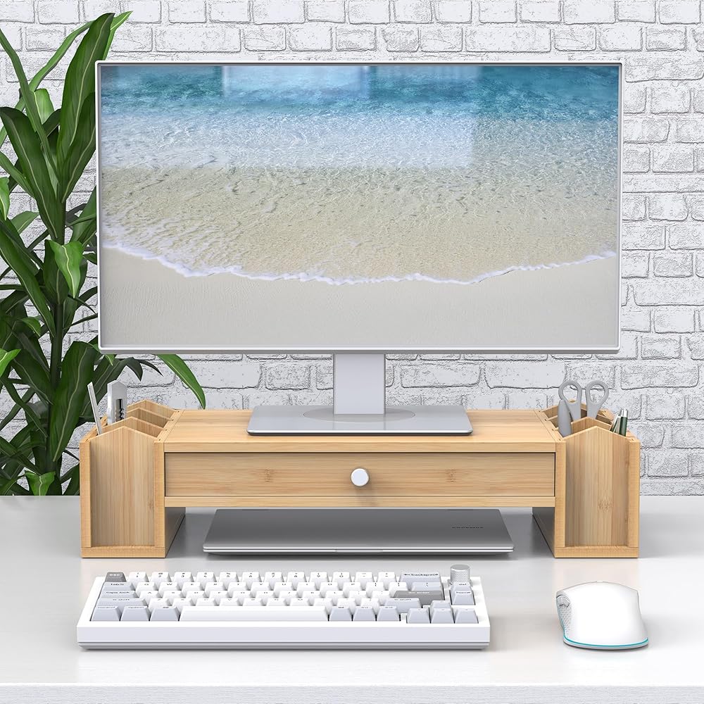 حامل شاشة مع درج وحامل أقلام، منظم مكتب مع مساحة تخزين للكمبيوتر المحمول iMac، Natural Banboo