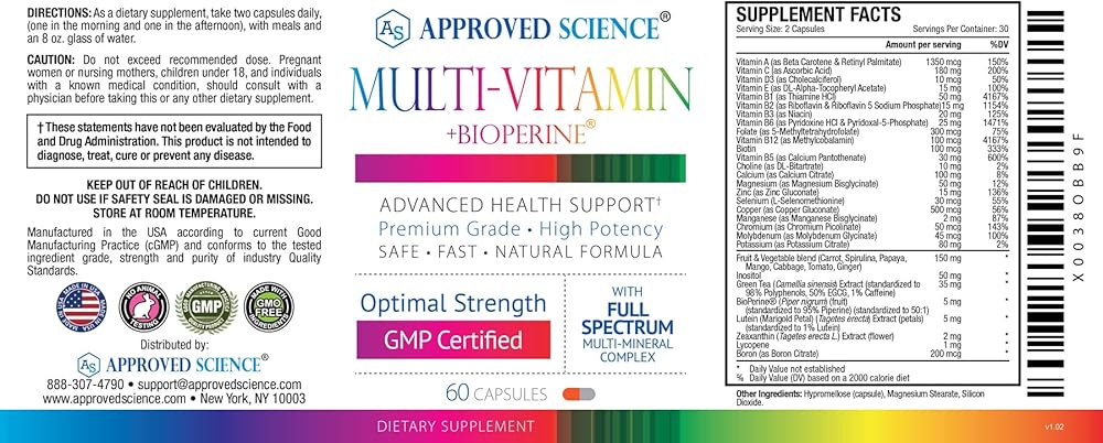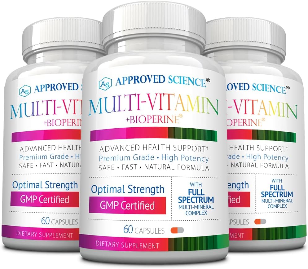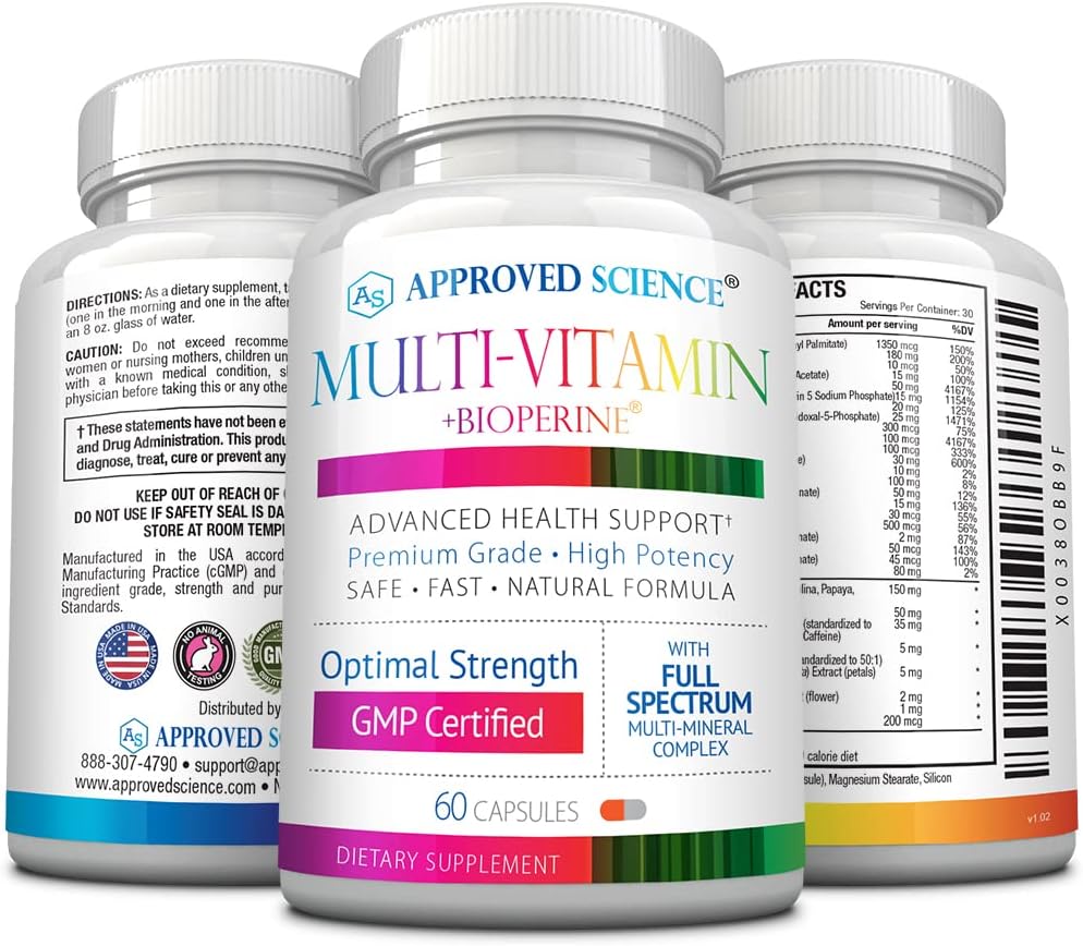 Approved Science has formulated a Multi-Vitamin with ingredients that are optimal strength, powerful, and 100% safe and natural. Each serving is packed with essential vitamins, a full-spectrum multi-mineral complex, BioPerine and more, to provide health and wellness for the whole body. GMO-free and cruelty-free.