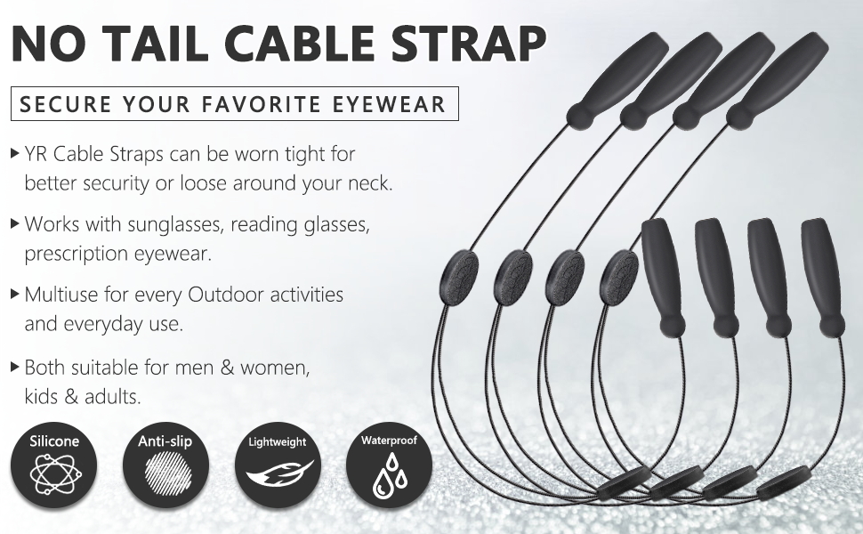 لا يوجد تصميم الذيل. تم تجهيز أحزمة كابلات النظارات الشمسية الخاصة بنا بمنزلقات مزدوجة لإنشاء تصميم بدون ذيل. لن تكون ملحوظة جدًا وضخمة عند ارتدائها.