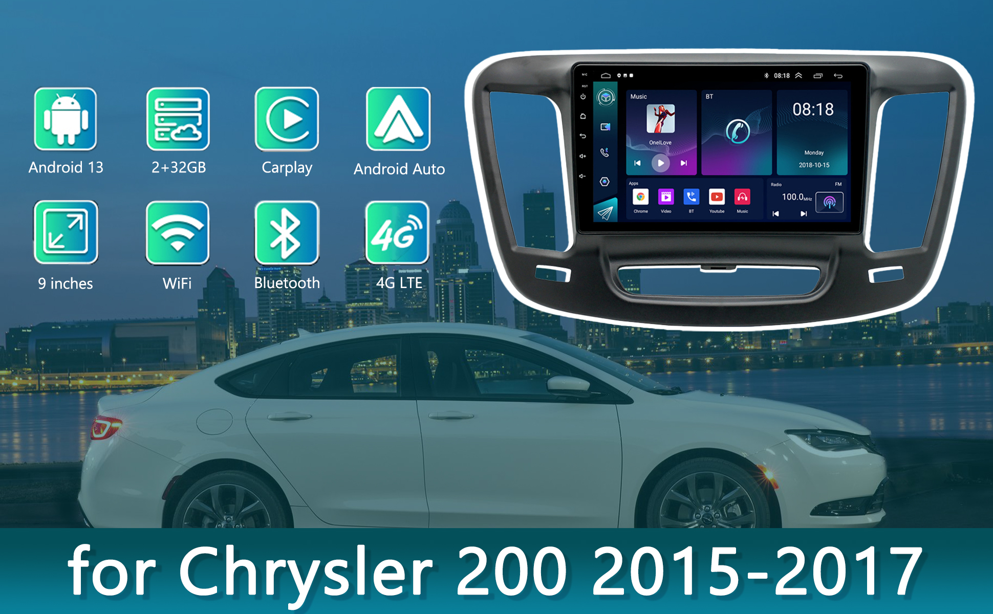 2015-2017 Chrysler 200 Radio Upgrade، نظام تشغيل Android 13 ستيريو للسيارة Chrysler 200، شاشة لمس 9 بوصة نظام تحديد المواقع العالمي (GPS)، كاميرا احتياطية AHD، تشغيل لاسلكي مدمج، 2 + 32 جيجابايت