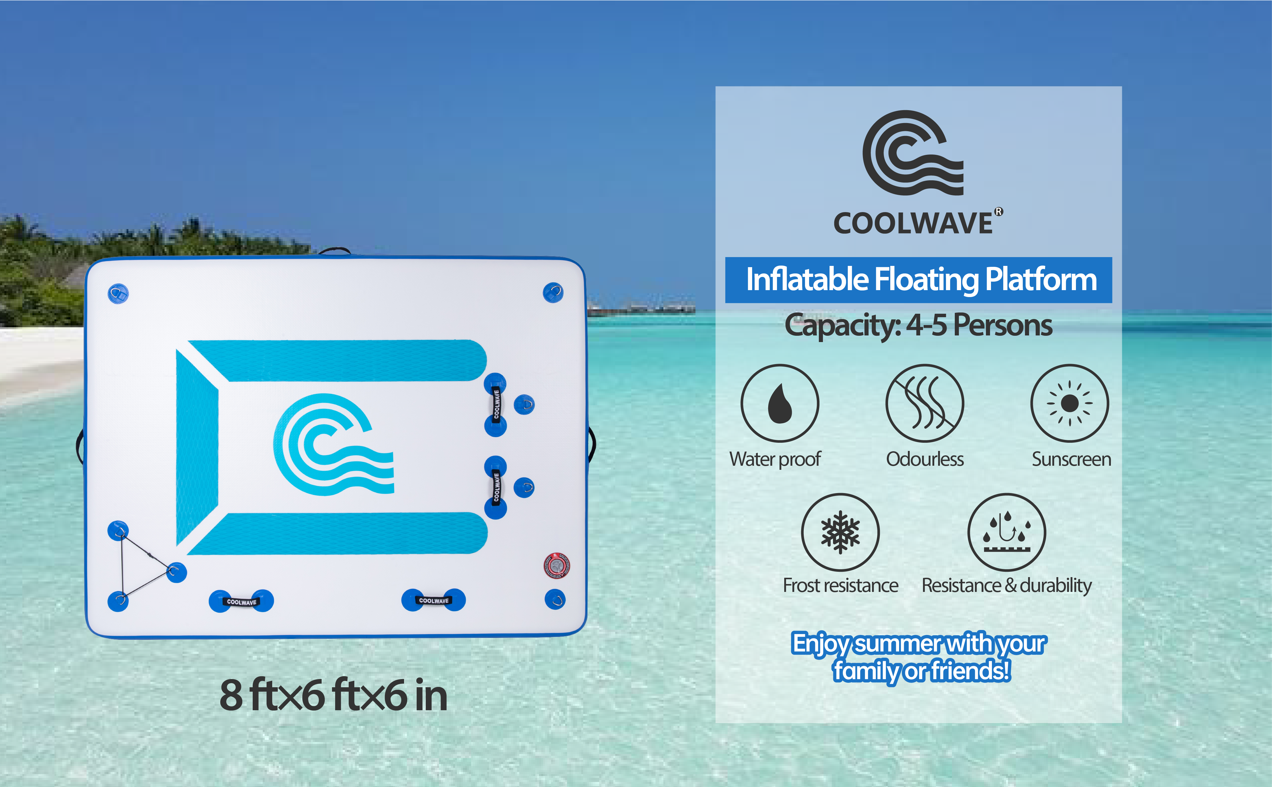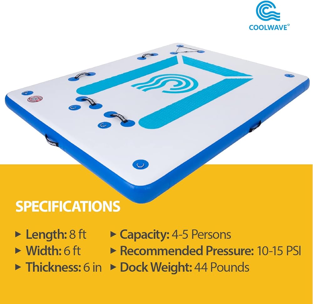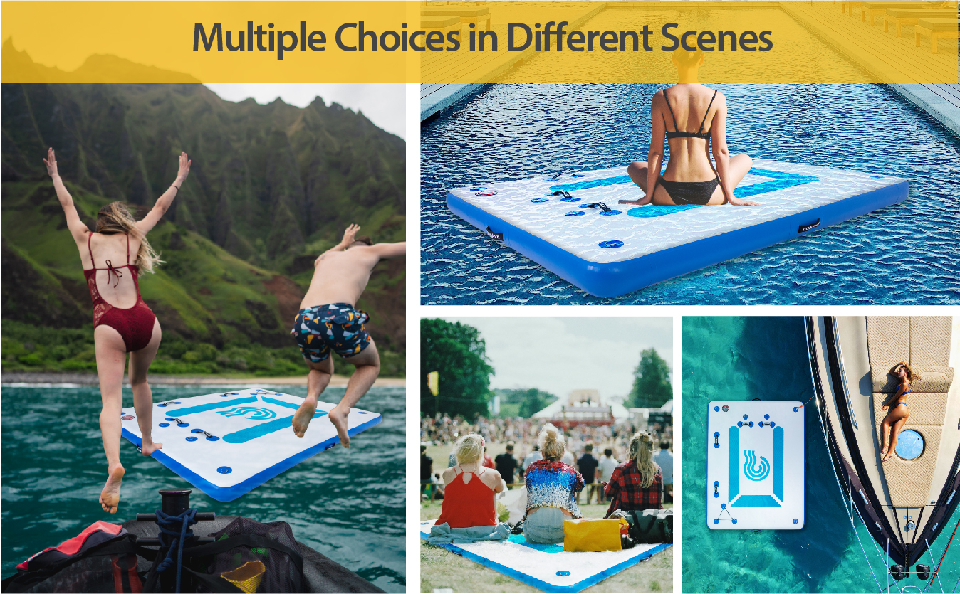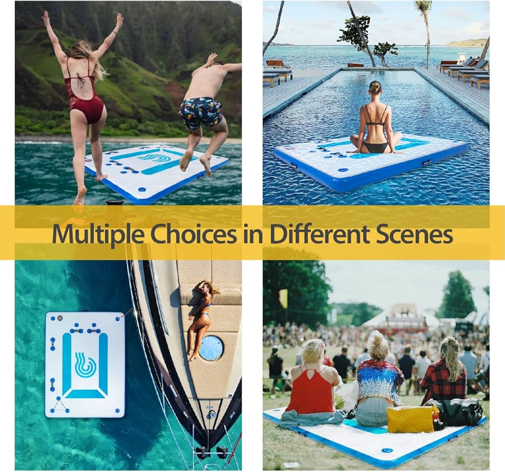 ✔Big Size - The inflatable dock is 8x6 ft, 6 inches thick. It can hold 4-5 people weighed about 500lbs. You can place lounge chairs and cooler on it. Great for swimming, sunbathing, yoga, fishing, or floating. Just start to enjoy a ton of fun on the water.