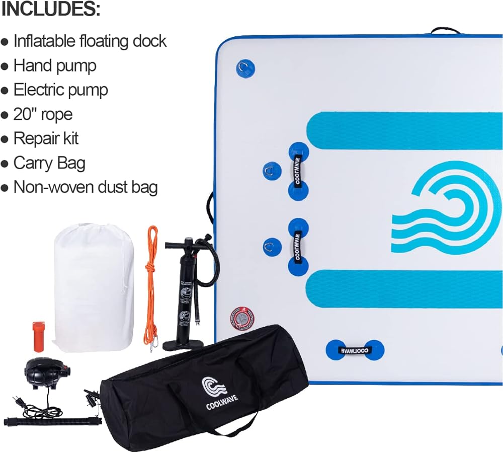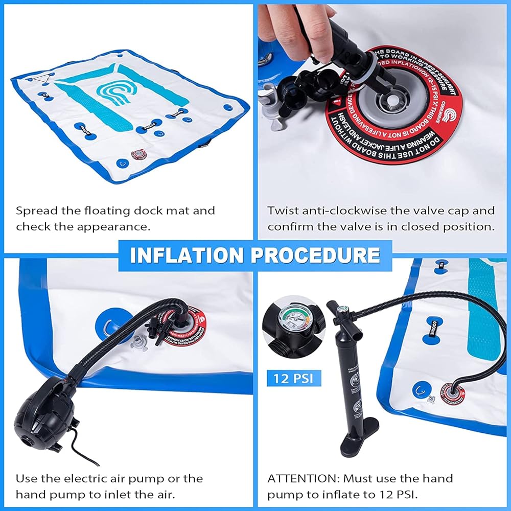 ✔Electric Air Pump - We provide both electric air pump and hand pump for you to inflate and deflate the dock instantly, you can use any of them at will. Our hand pump has a pressure gauge. When the gage reads 10-15 psi, the inflation can be stopped.